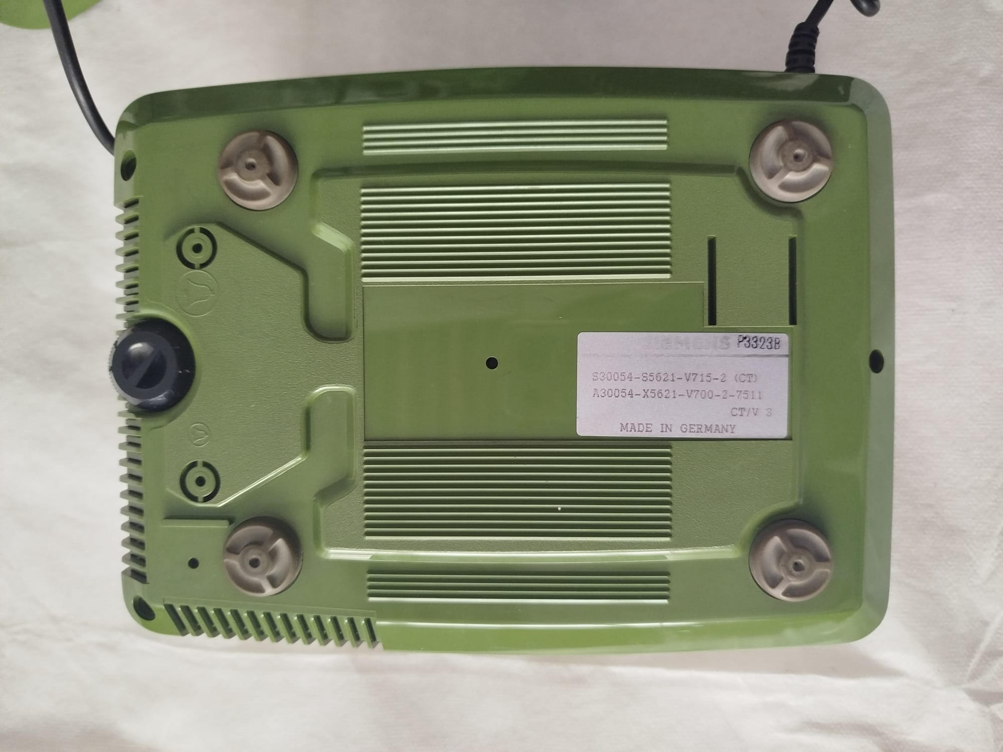 Este dispositivo es un teléfono Siemens de la década de 1980, diseñado con un estilo clásico de pulsador tipo botón. Fabricado en plástico de color verde, cuenta con teclas negras y un botón de control de volumen. En la parte inferior se encuentra el marcado original del fabricante: Siemens S30054-S5388-P221-6 (CT) A30054-X5388-P200-2-7511 CT/M12.