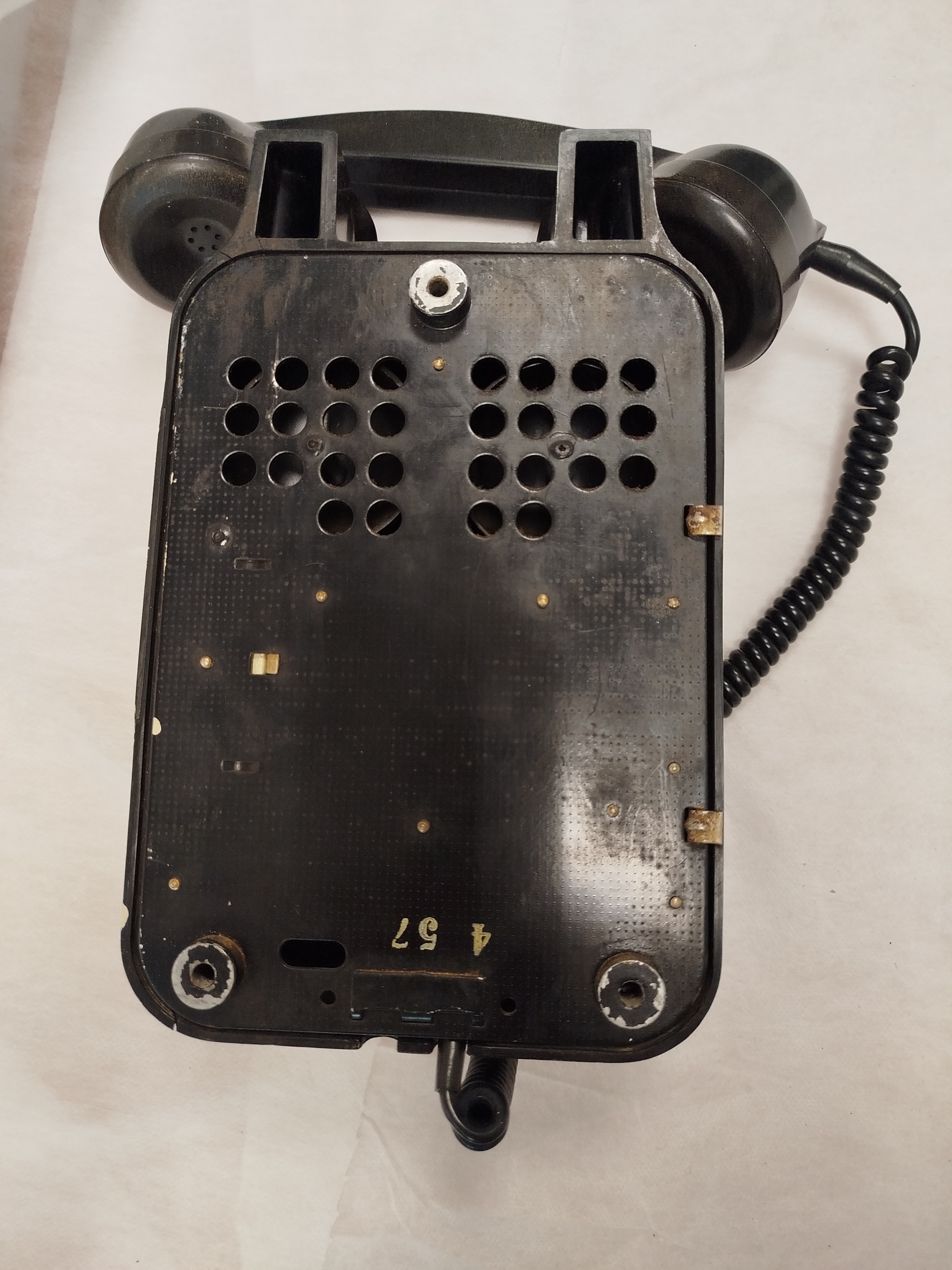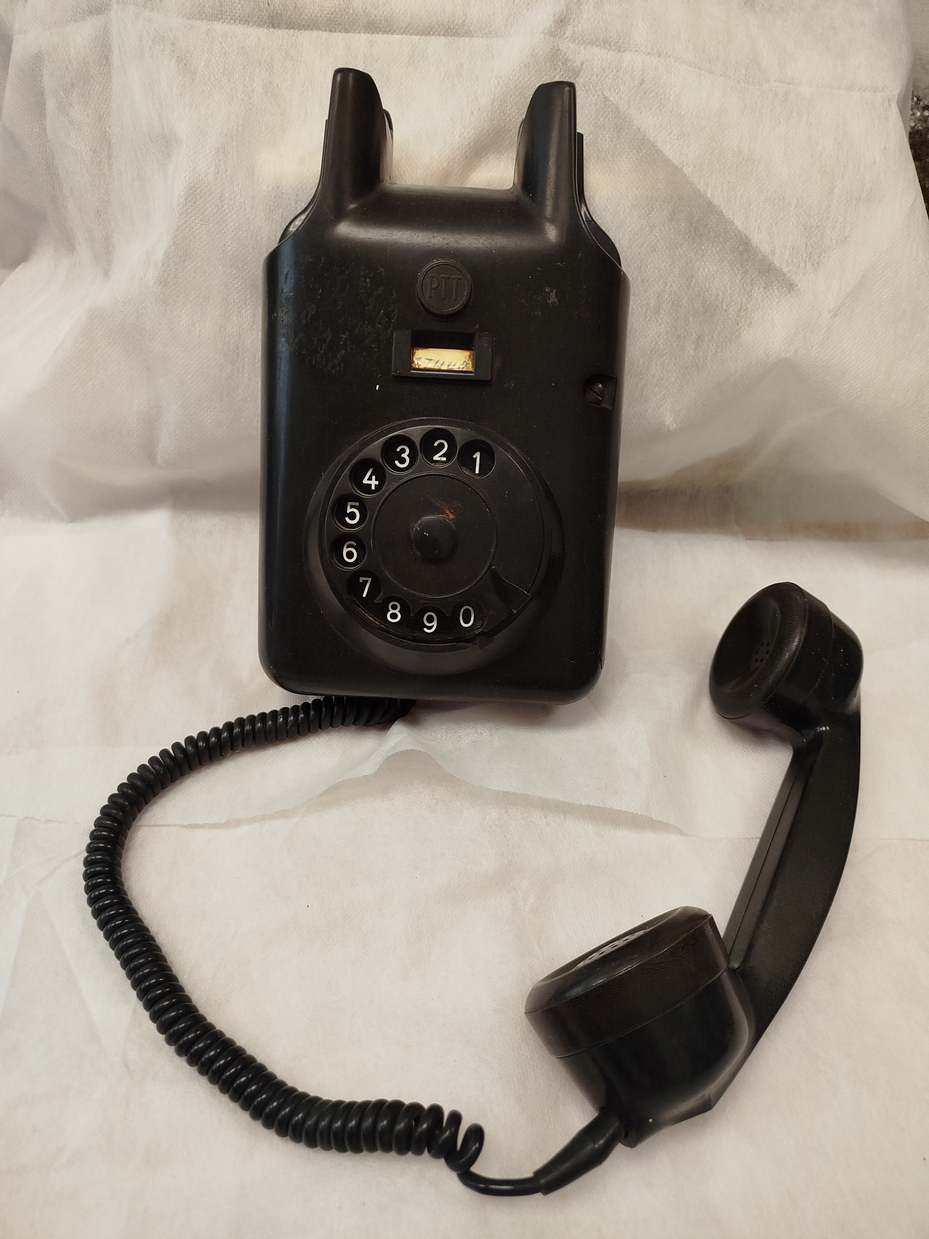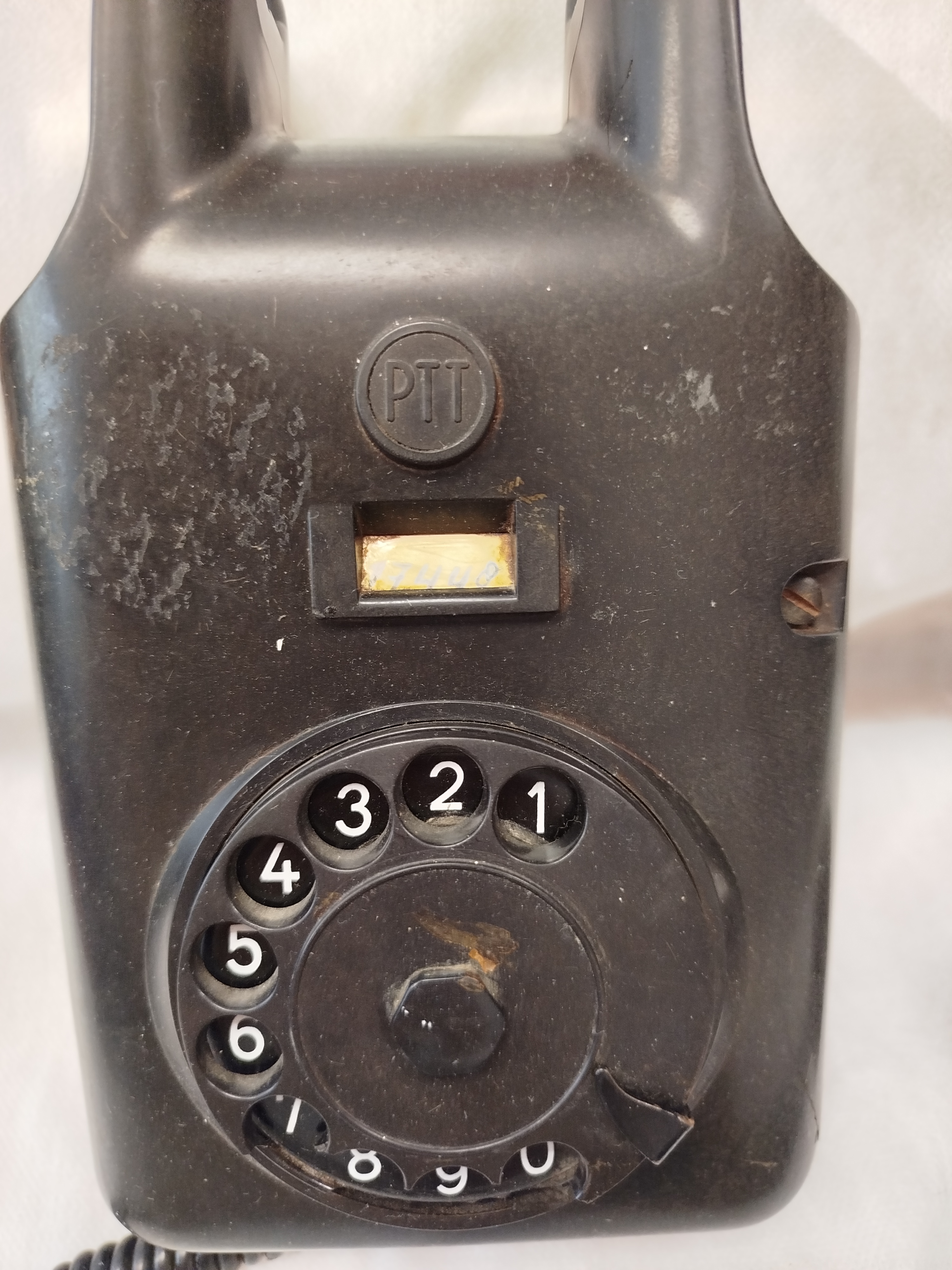Teléfono de marcación rotatoria (dial), fabricado en plástico tipo baquelita por la marca Ericsson Rijen para la PTT (Compañía Estatal de Correos, Telegrafía y Teléfonos). Diseñado para montaje en pared y de color negro. Presenta signos de uso: rotura visible en la zona del dial a partir del número 7, restos de adhesivo en la parte superior izquierda del frontal, y una grieta en la esquina inferior derecha.