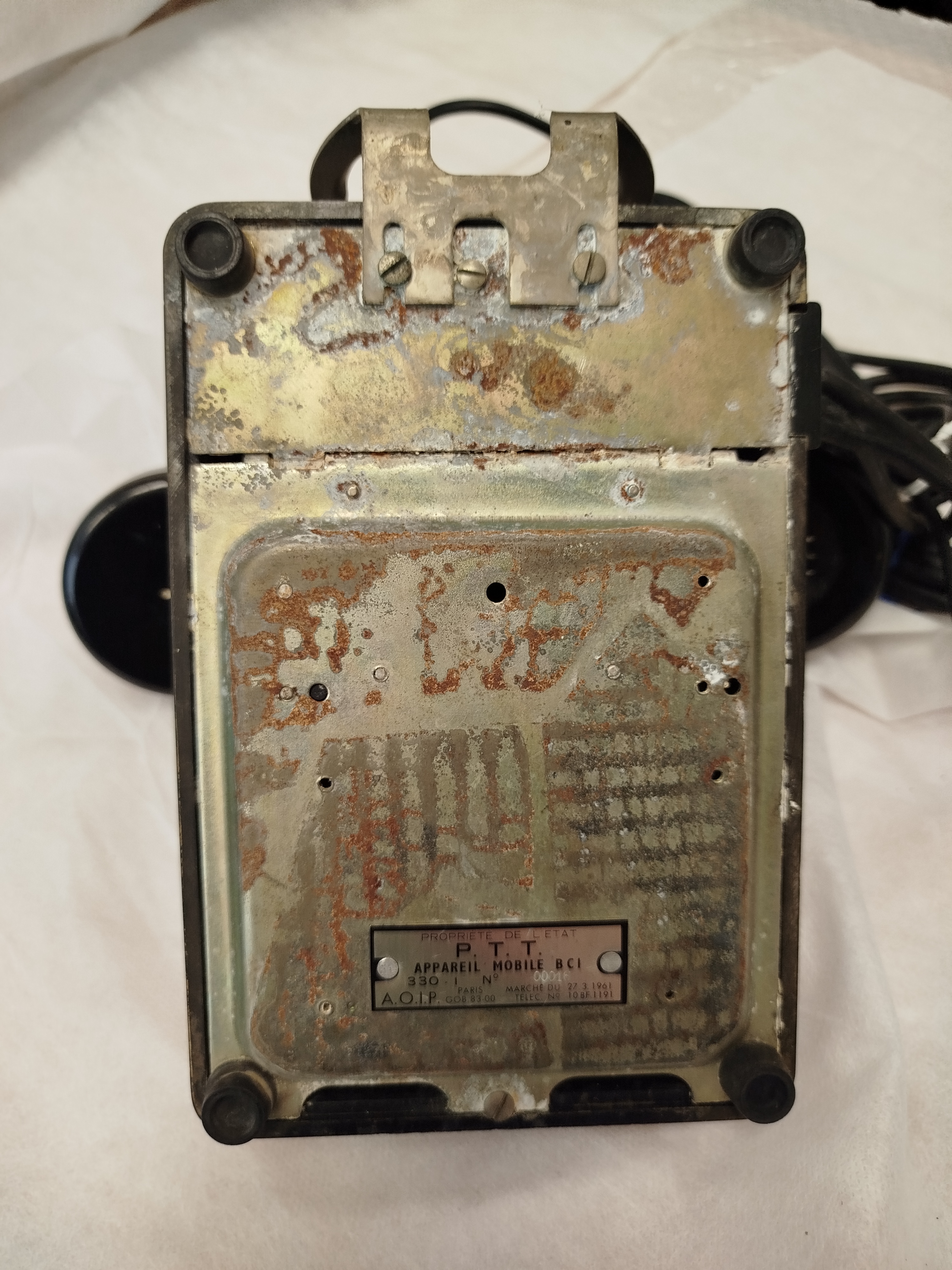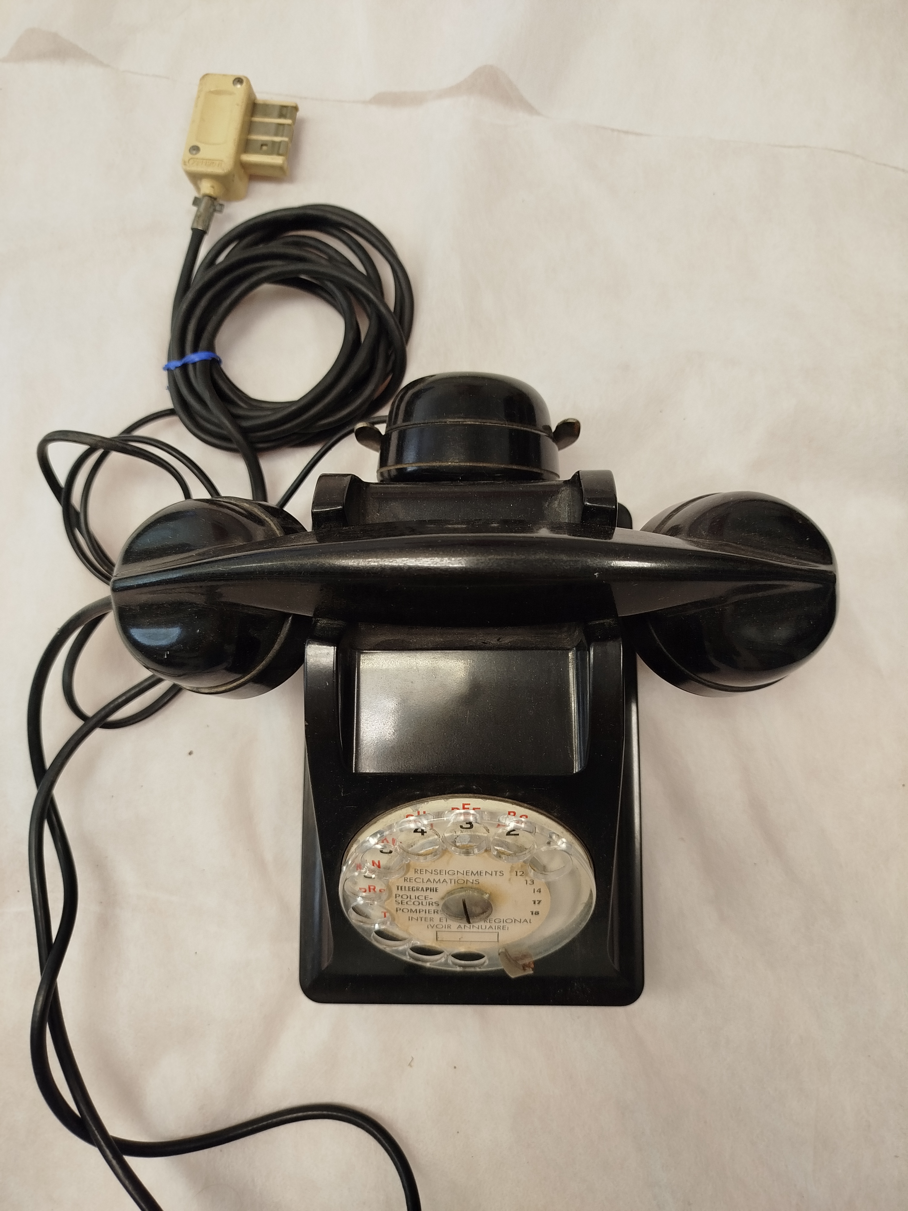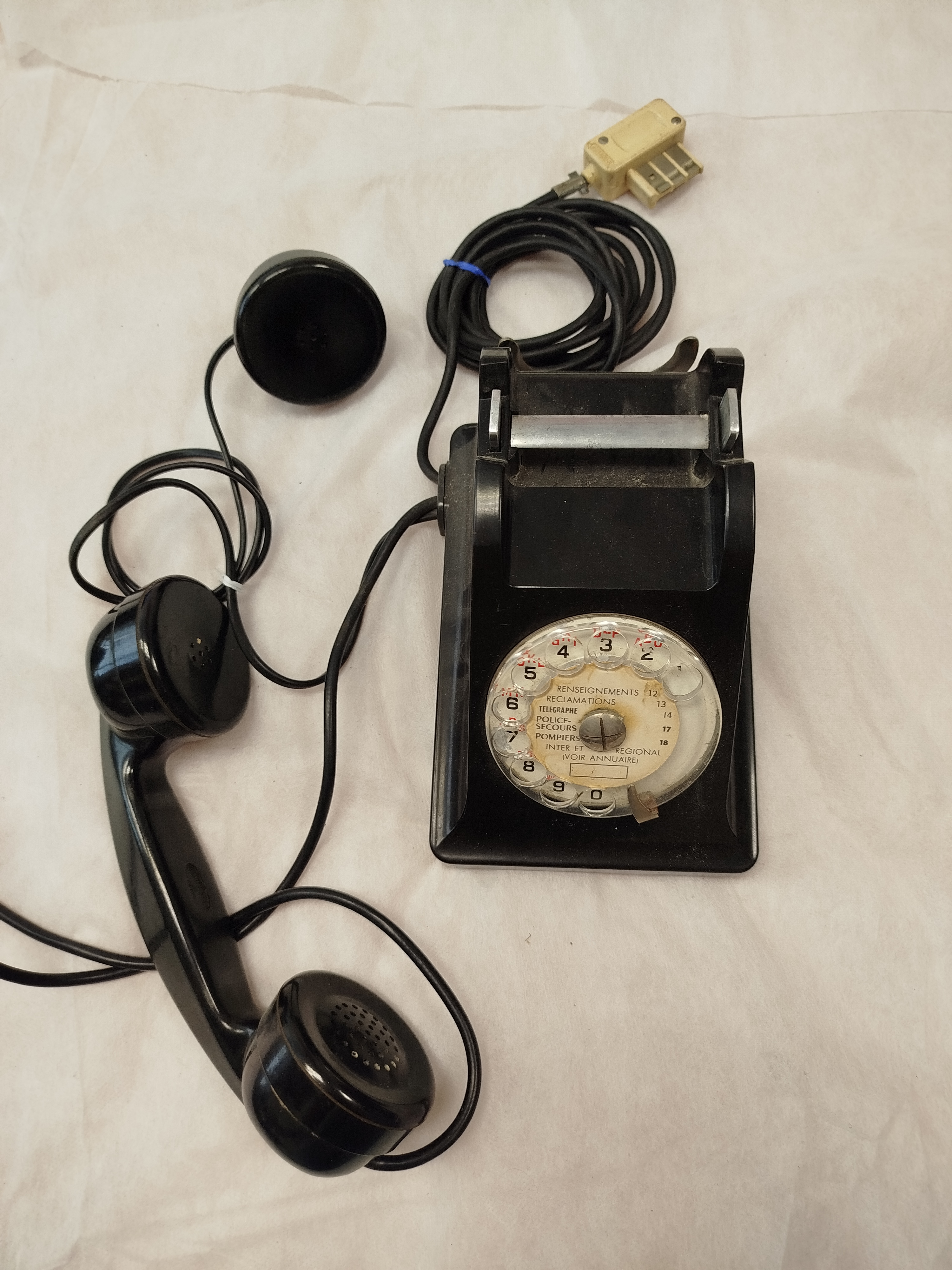 Teléfono de marcación rotatoria fabricado en Francia durante la década de 1960. En el interior del dial se indica que es propiedad del Estado, y en la parte trasera cuenta con una cartela donde se especifican más datos, incluyendo el lugar de fabricación (París) y el año. Este modelo incorpora un altavoz auxiliar, característica poco común en teléfonos de la época.