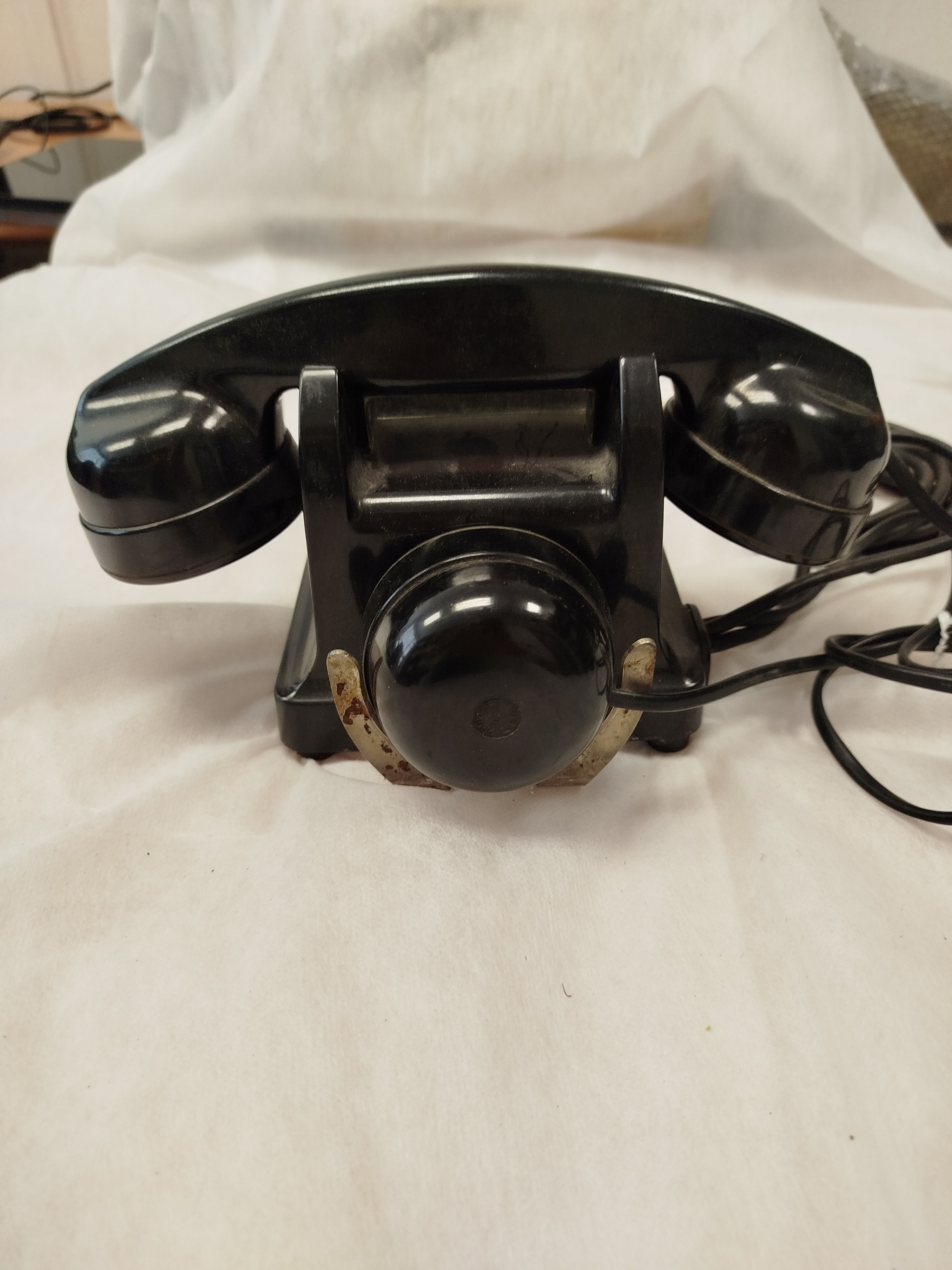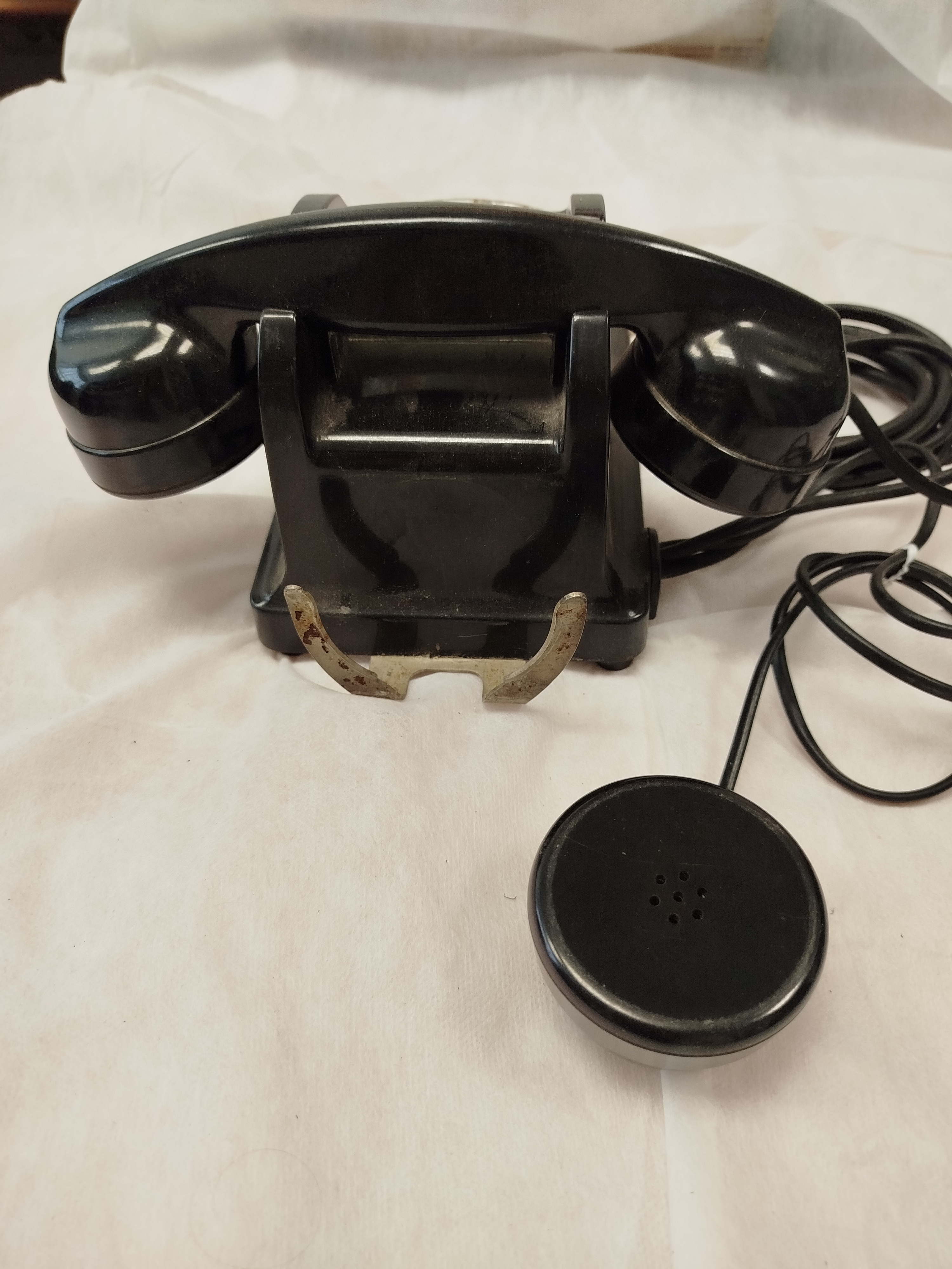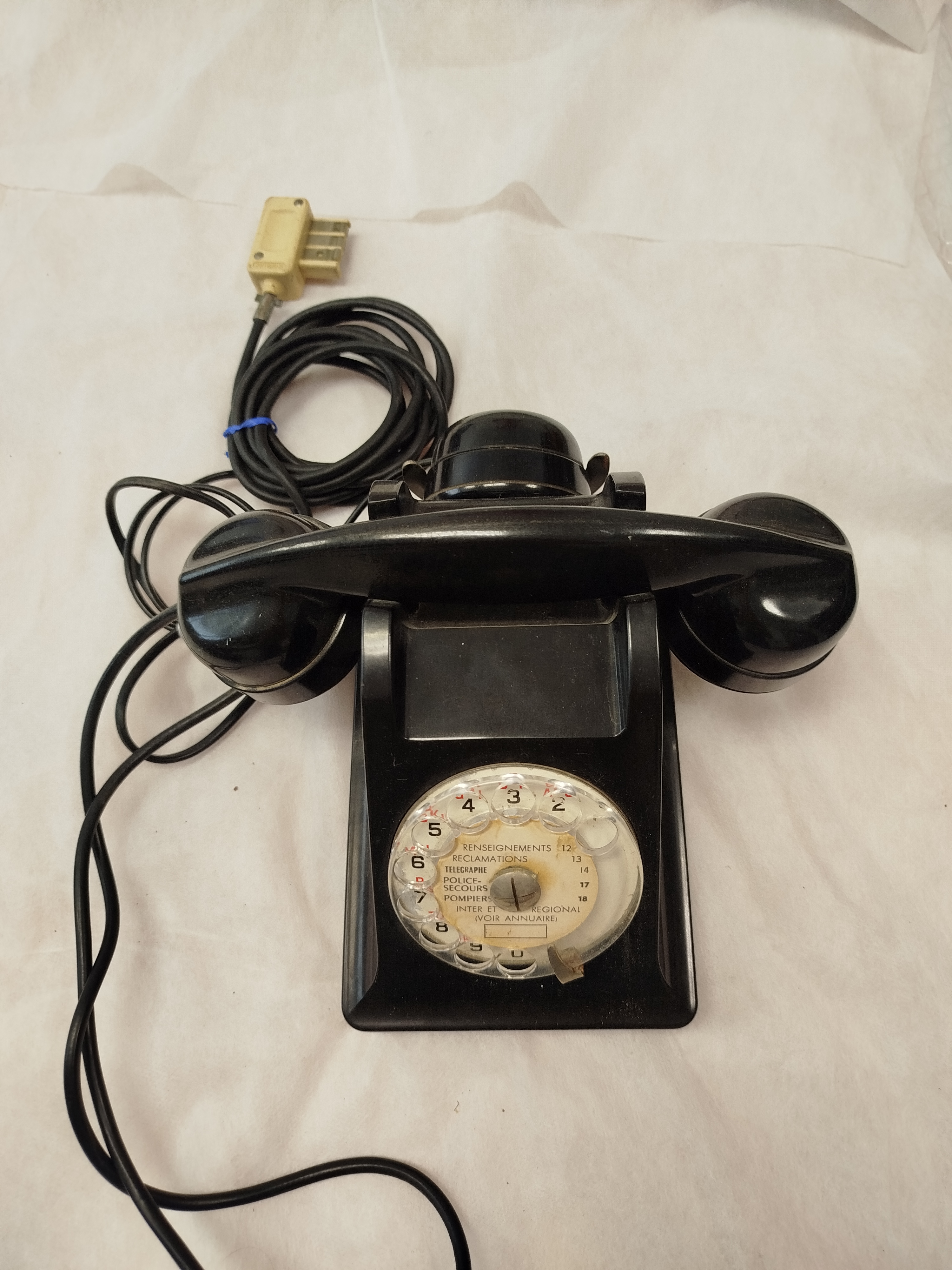 Teléfono de marcación rotatoria fabricado en Francia durante la década de 1960. En el interior del dial se indica que es propiedad del Estado, y en la parte trasera cuenta con una cartela donde se especifican más datos, incluyendo el lugar de fabricación (París) y el año. Este modelo incorpora un altavoz auxiliar, característica poco común en teléfonos de la época.
