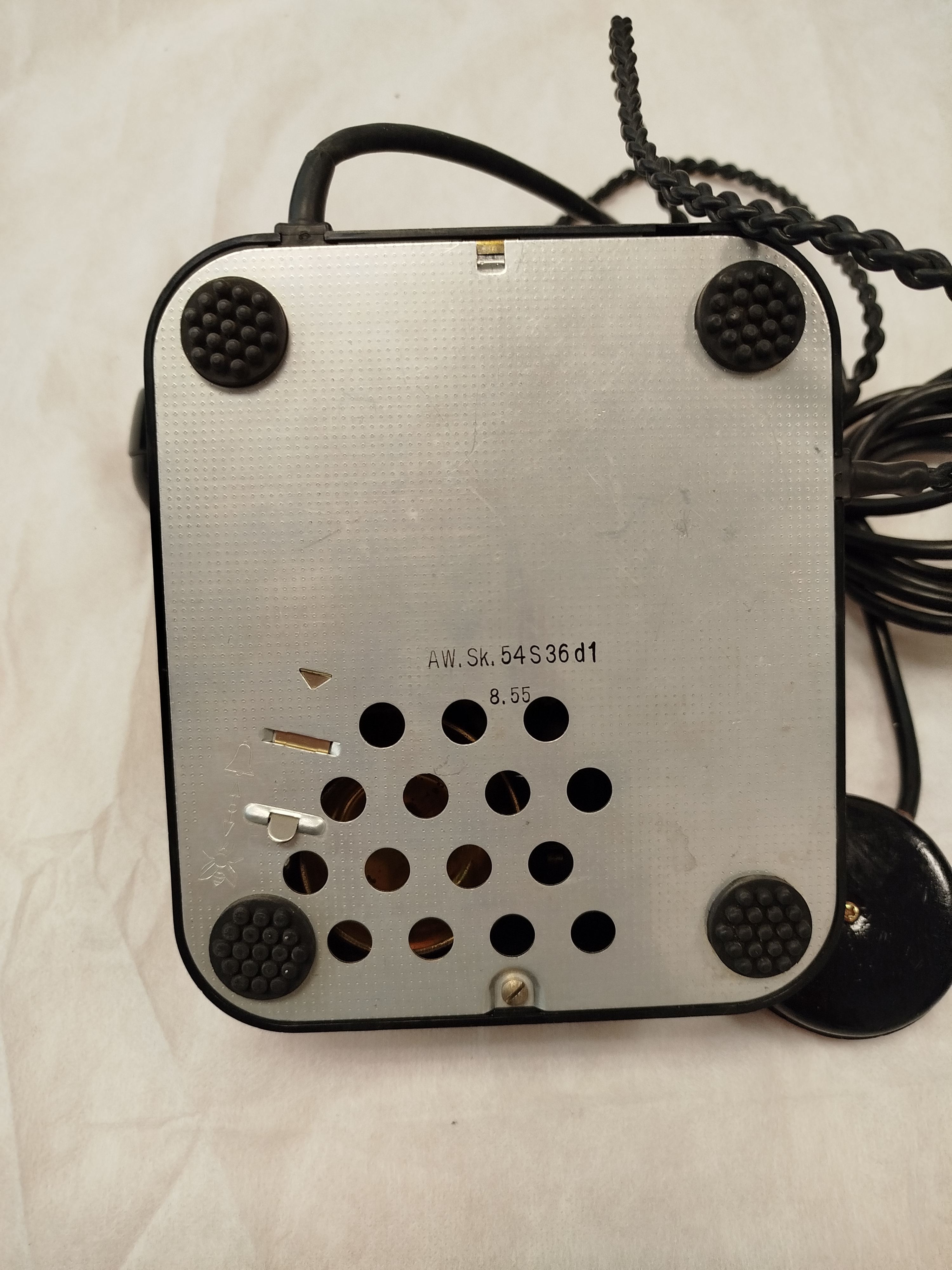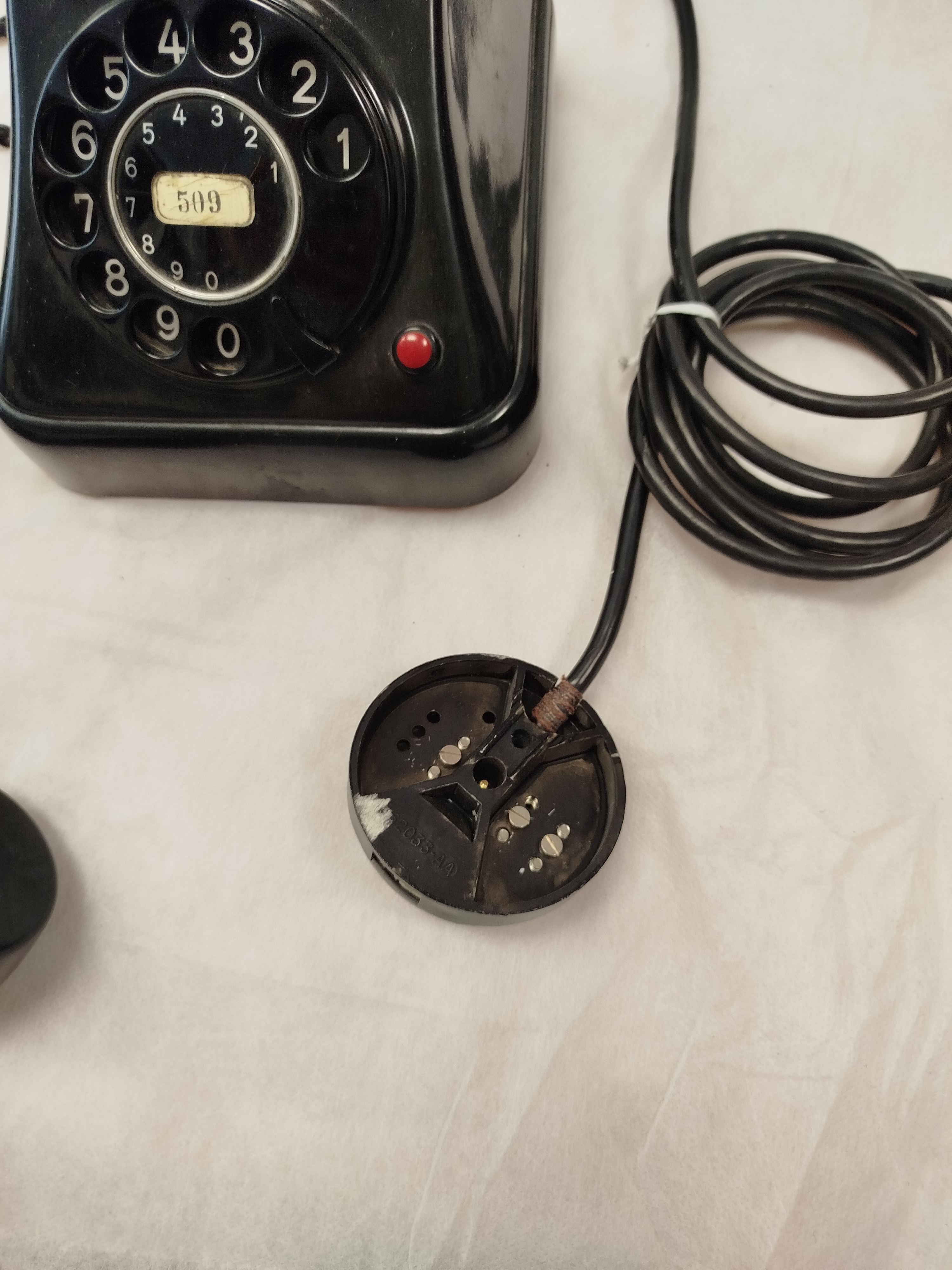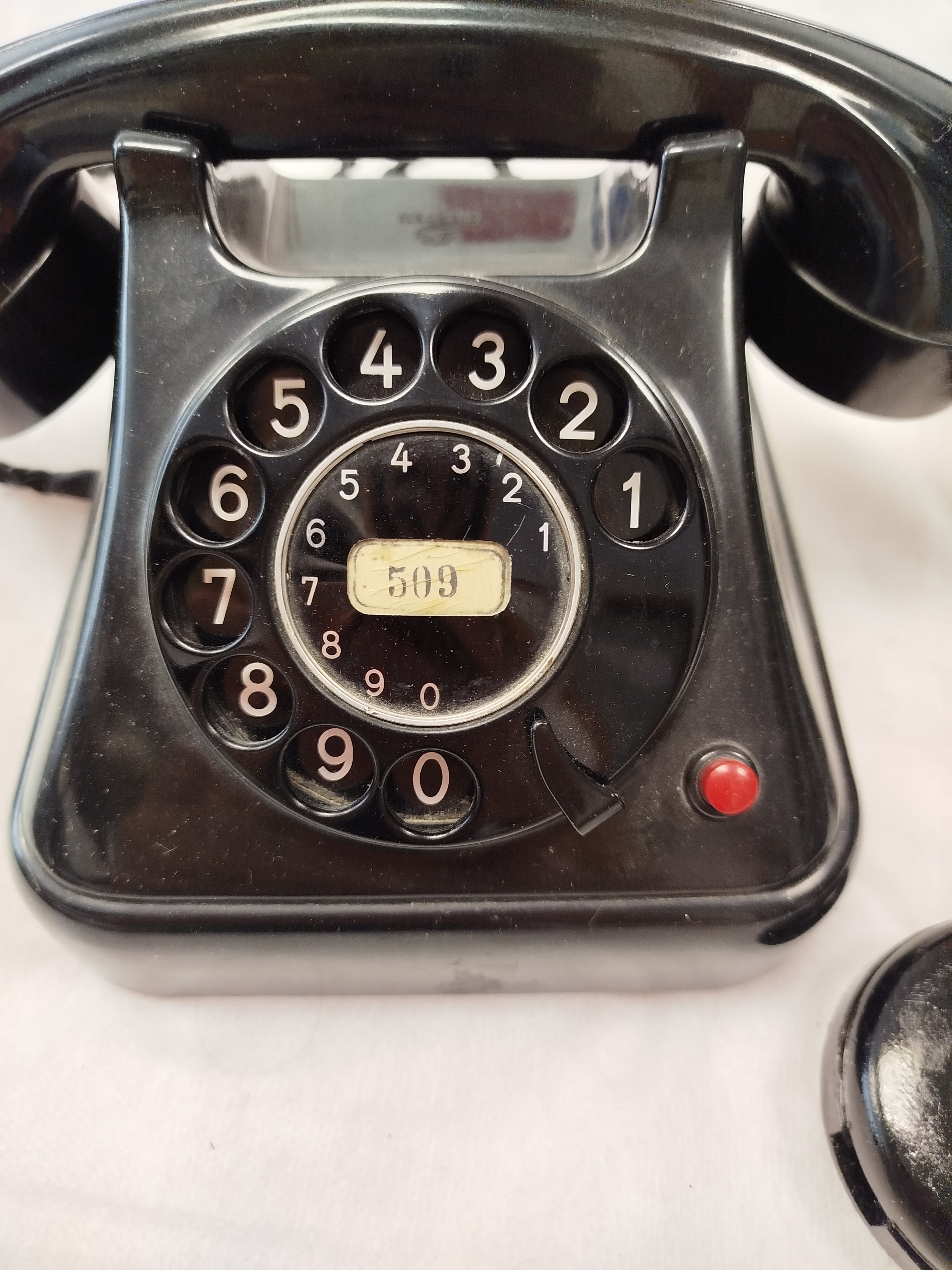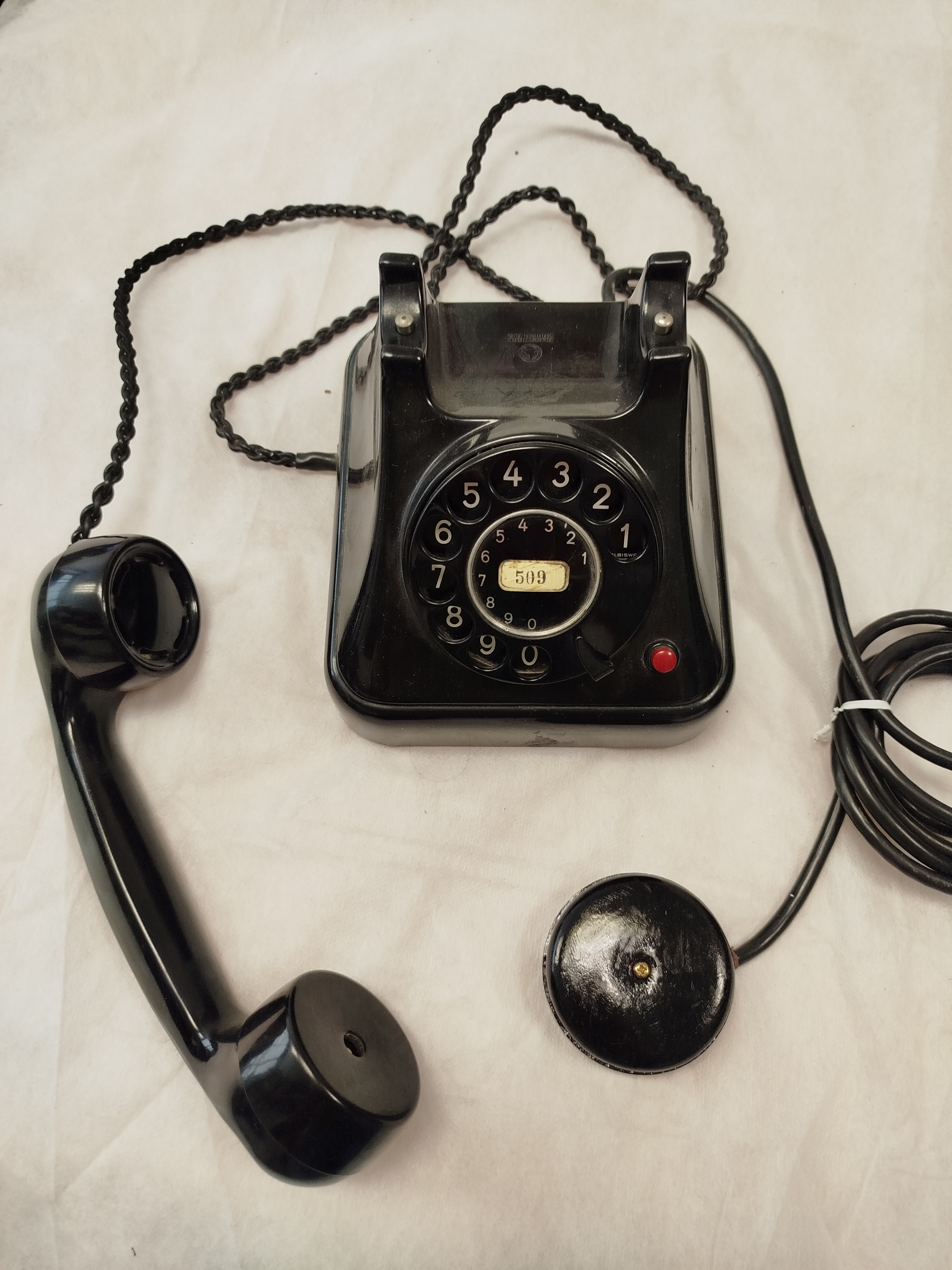 Teléfono de sobremesa fabricado en baquelita negra, con dial rotatorio, de la marca Albiswerk Zürich AG. Modelo clásico suizo, representativo del diseño de mediados del siglo XX.