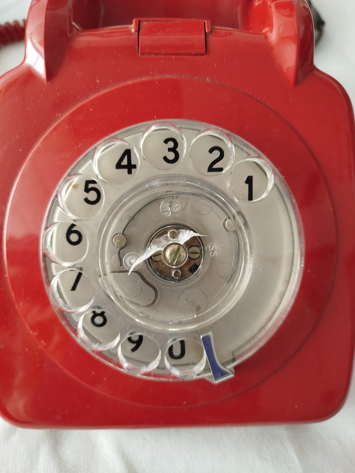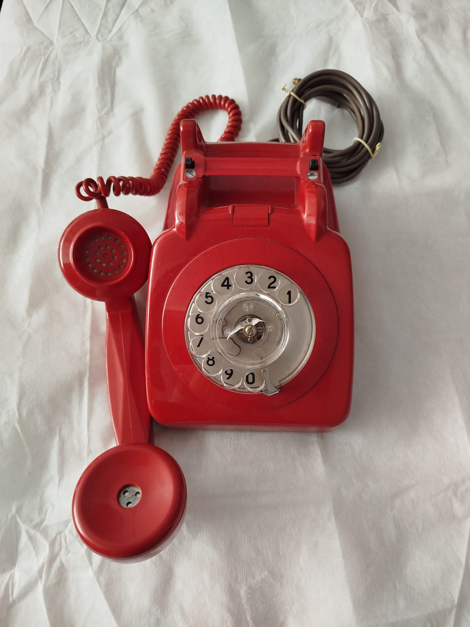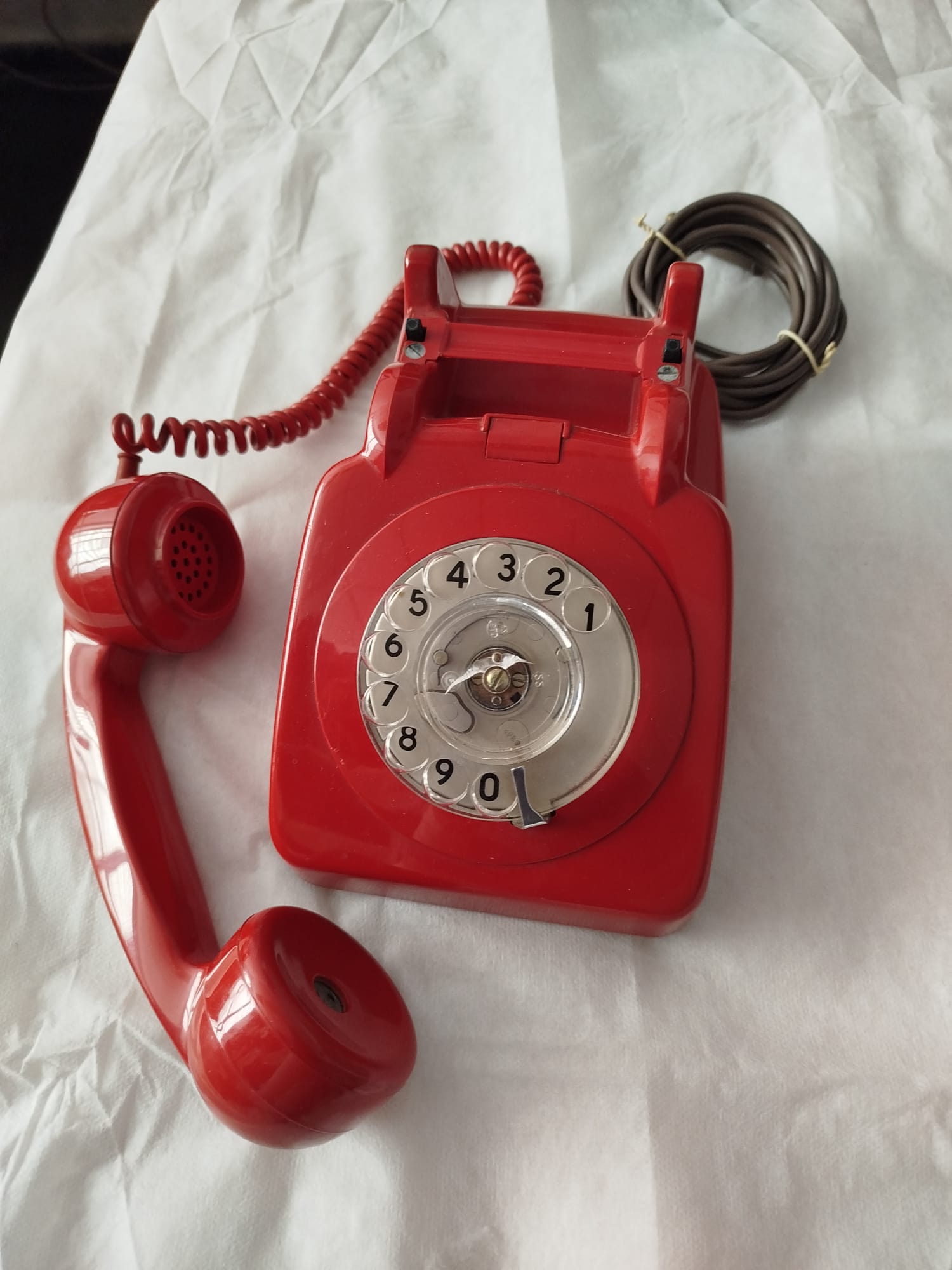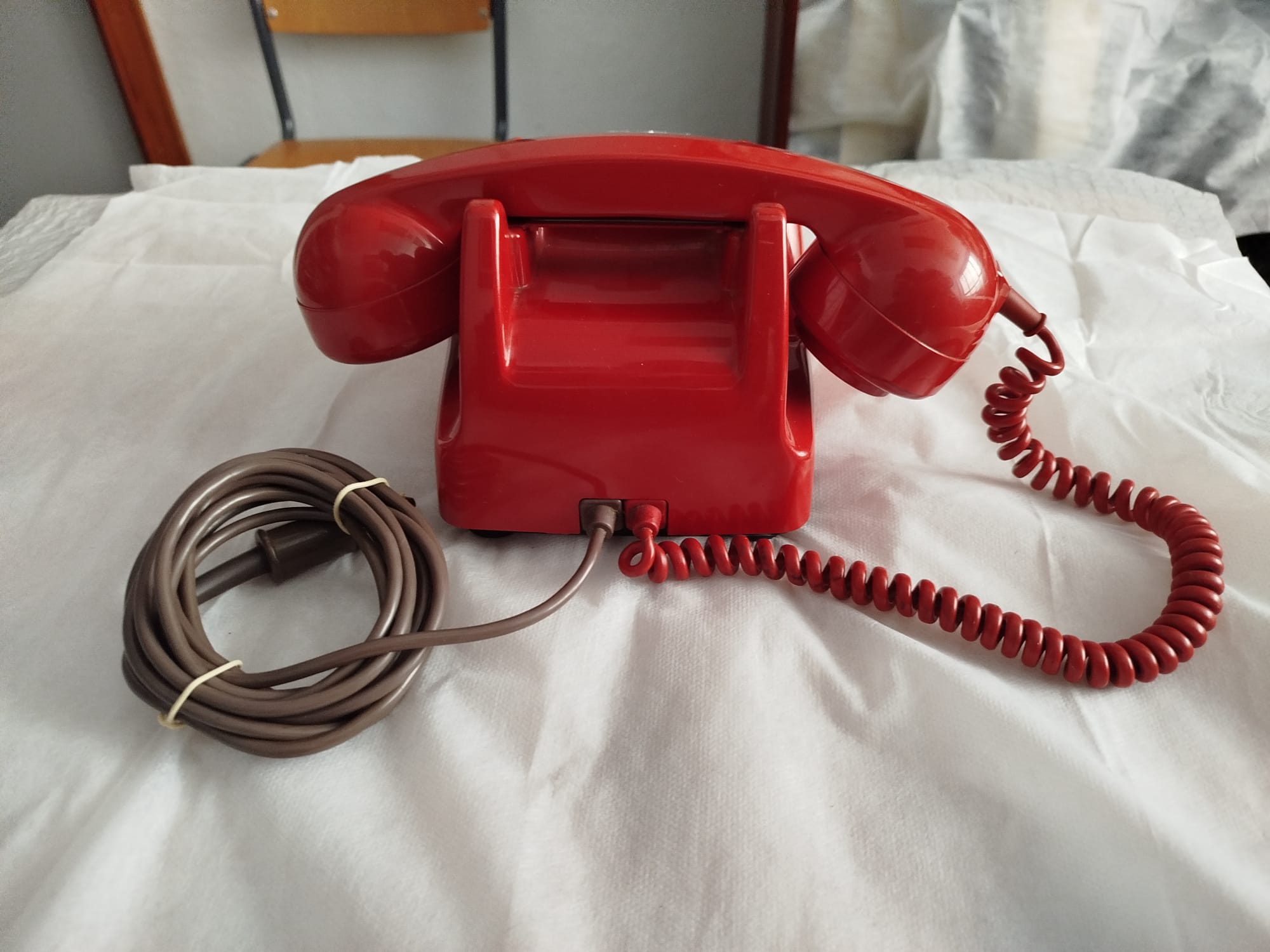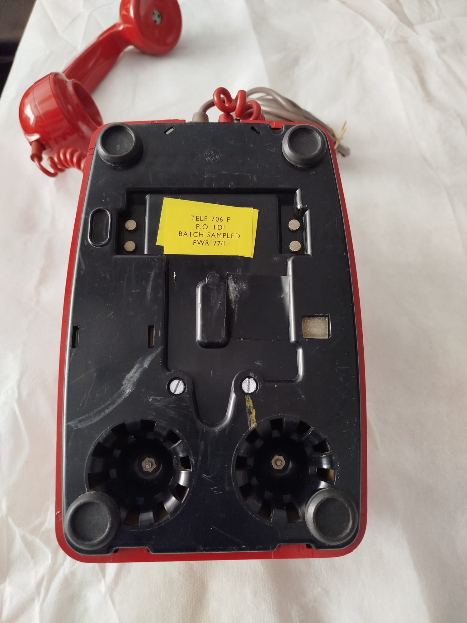 El teléfono GPO modelo 706F FWR 77/1 de 1977 es un diseño icónico británico de los años 60 y 70, fabricado por la General Post Office (GPO) en Inglaterra. Con su clásico dial de disco y cable en espiral, destaca por su construcción en acrílico termoplástico ligero y duradero, disponible en siete colores, siendo este ejemplar en rojo lacado. Su diseño ergonómico y moderno presentaba curvas suaves, versatilidad para distintas aplicaciones mediante un marco extraíble del dial y tecnología avanzada para la época, incluyendo regulador de corriente enchufable y cableado con placa de circuito impreso. Está en buen estado, con la única ausencia del disco interior del dial.