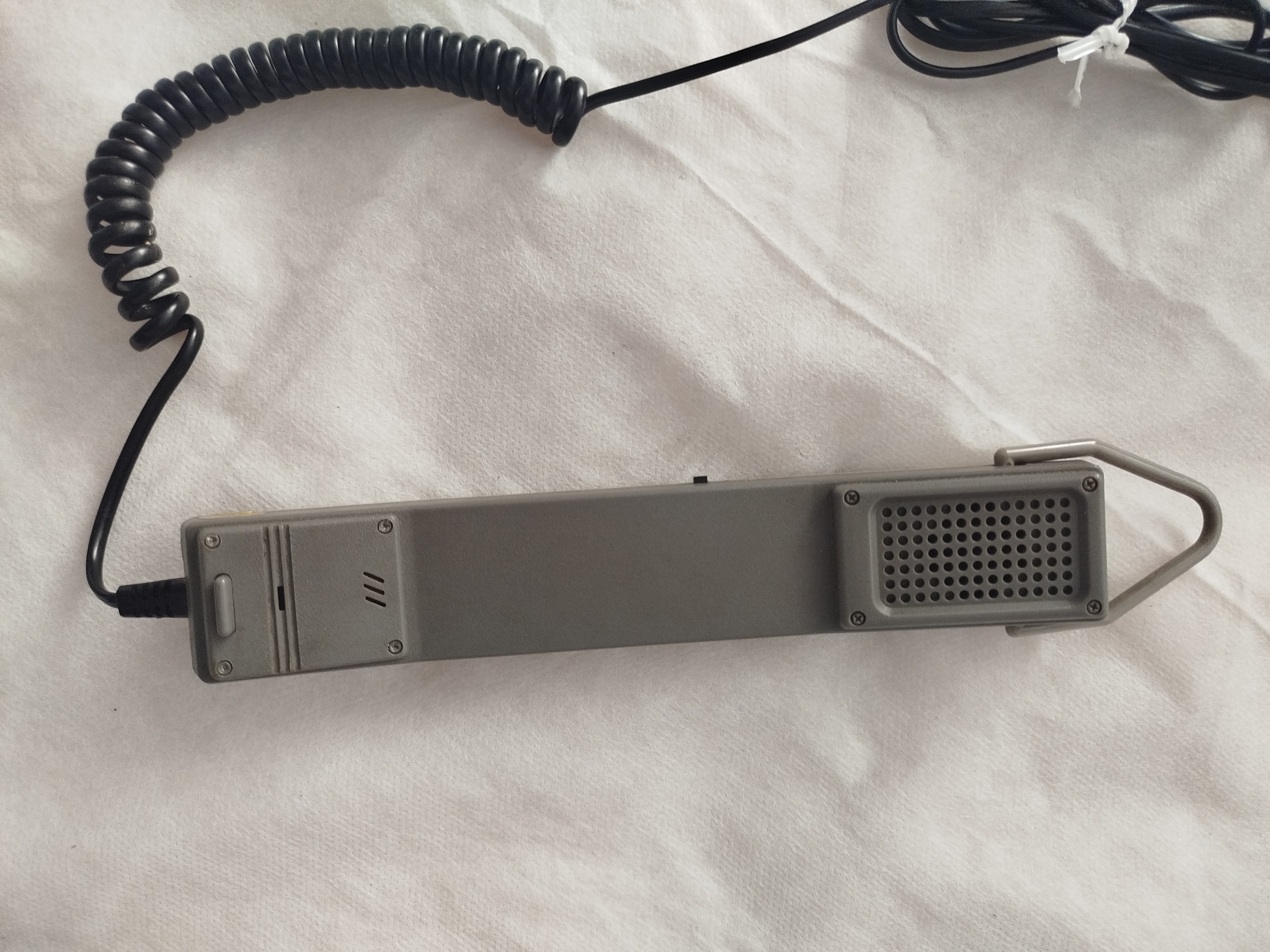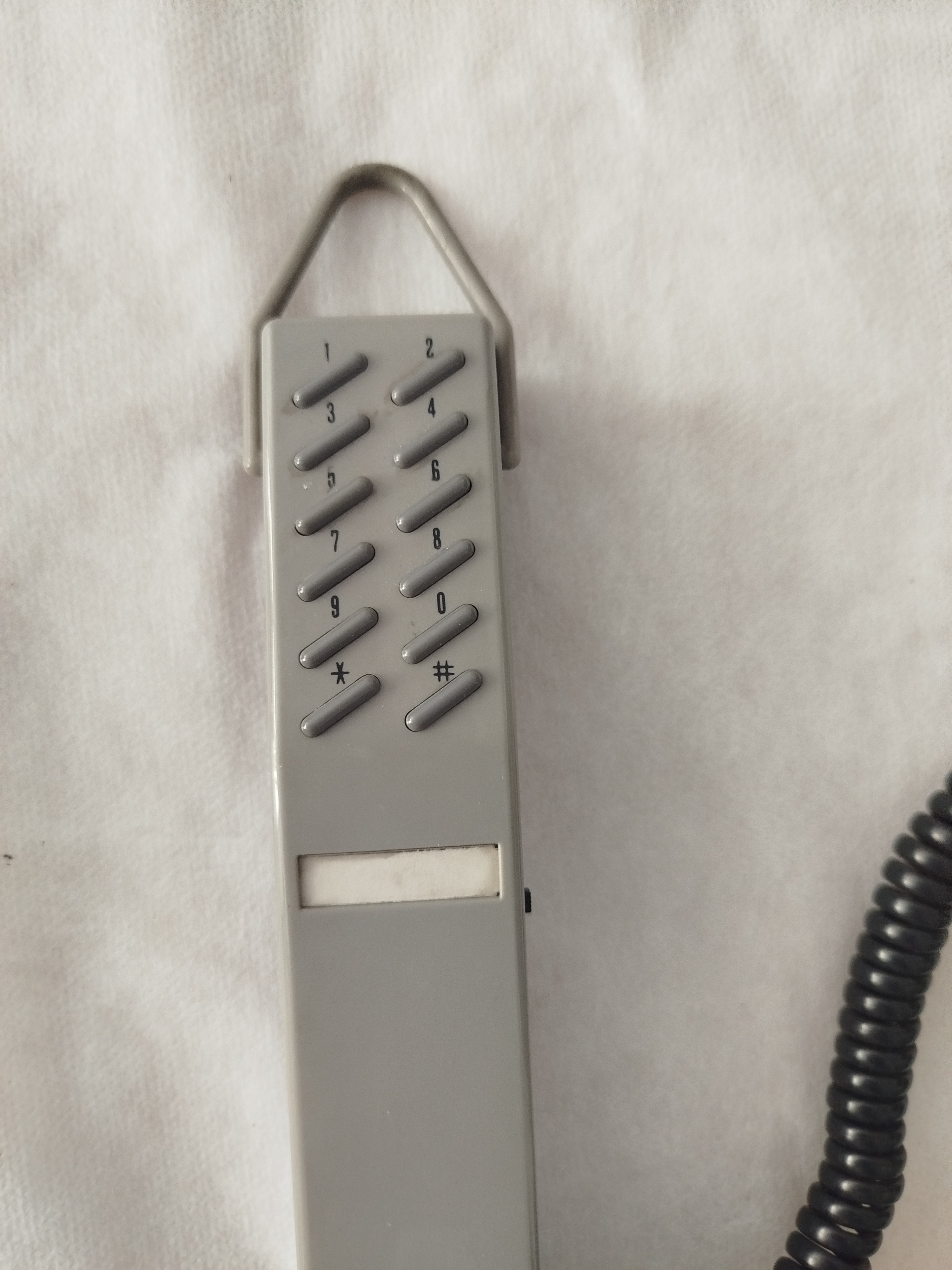 Teléfono fijo analógico de uso doméstico o de oficina, diseñado para instalación en pared. Fabricado en plástico ABS gris, con teclado numérico de 12 teclas y gancho metálico superior para colgar. Incluye cable en espiral con conector RJ11. Posee un diseño compacto y funcional, utilizado como extensión o aparato supletorio en líneas telefónicas de abonado. Presenta una pequeña ventana plástica posiblemente destinada a una etiqueta o número de extensión.