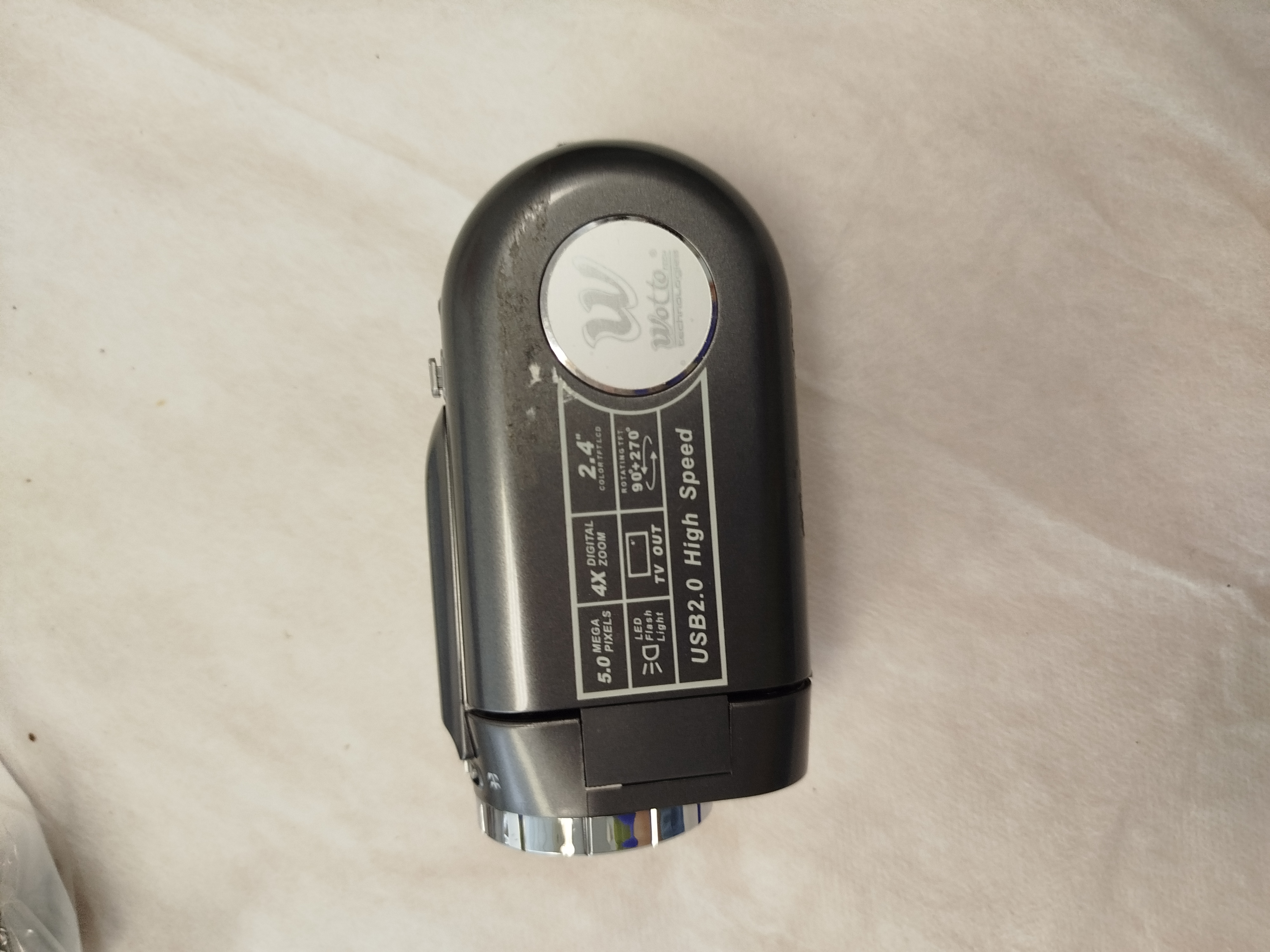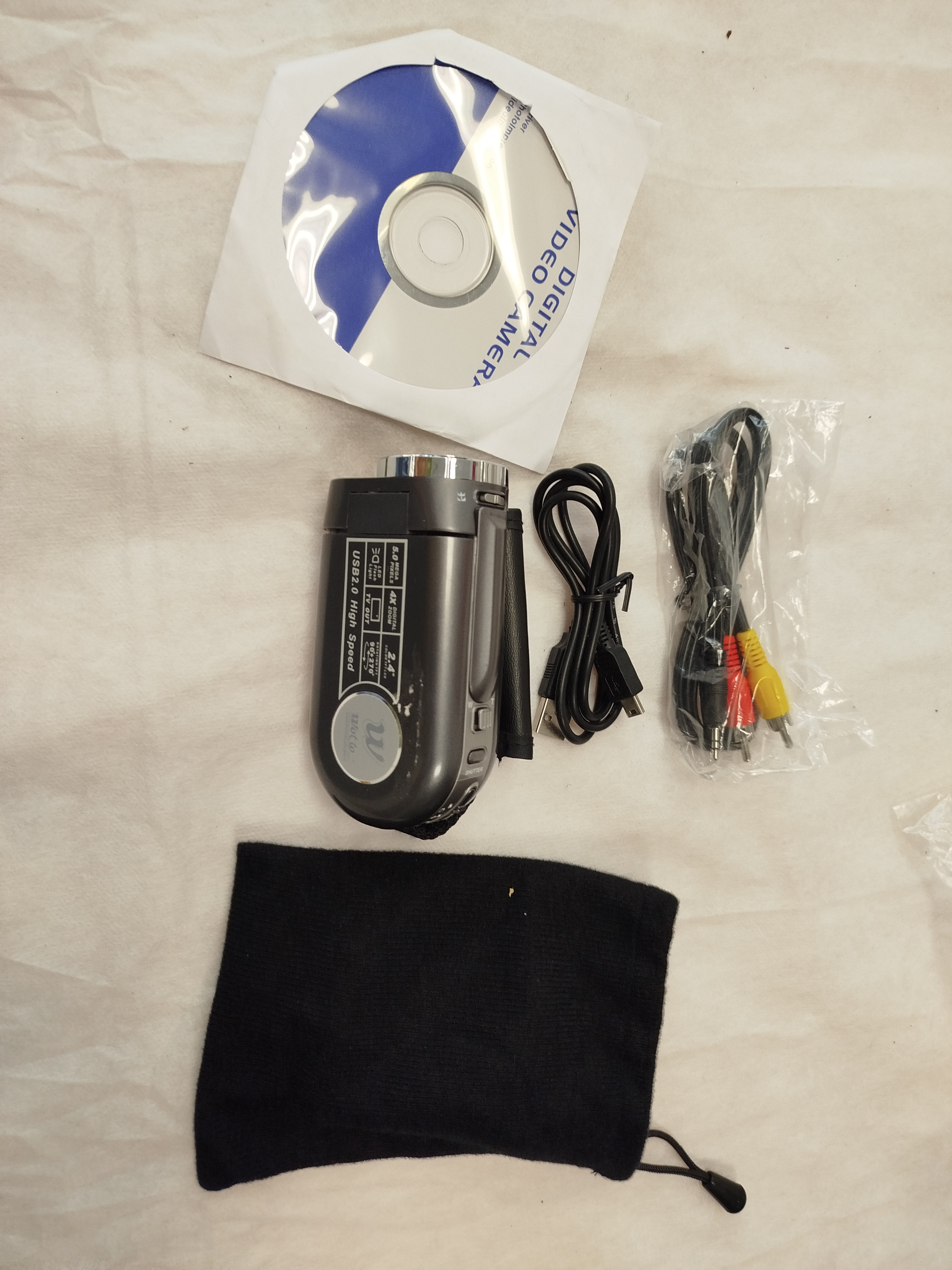 Cámara de vídeo digital Wotto SY-552SD, videocámara compacta de uso doméstico diseñada para grabación en formato digital sobre tarjeta SD. Representativa de la transición tecnológica de las primeras décadas del siglo XXI, combina portabilidad con funciones automáticas básicas, dirigidas a usuarios no profesionales. Incluye visor digital, pantalla abatible, controles integrados de zoom y conectividad para transferencia de archivos. Su diseño ligero en plástico negro con acabados metálicos refleja la estética y funcionalidad de los dispositivos accesibles en la era previa a la masificación del vídeo en teléfonos móviles. Viene con cable USB, tarjeta de memoria SD de 1 GB, manual del usuario, CD para ordenador, paquete de pilas y bolsa funda.