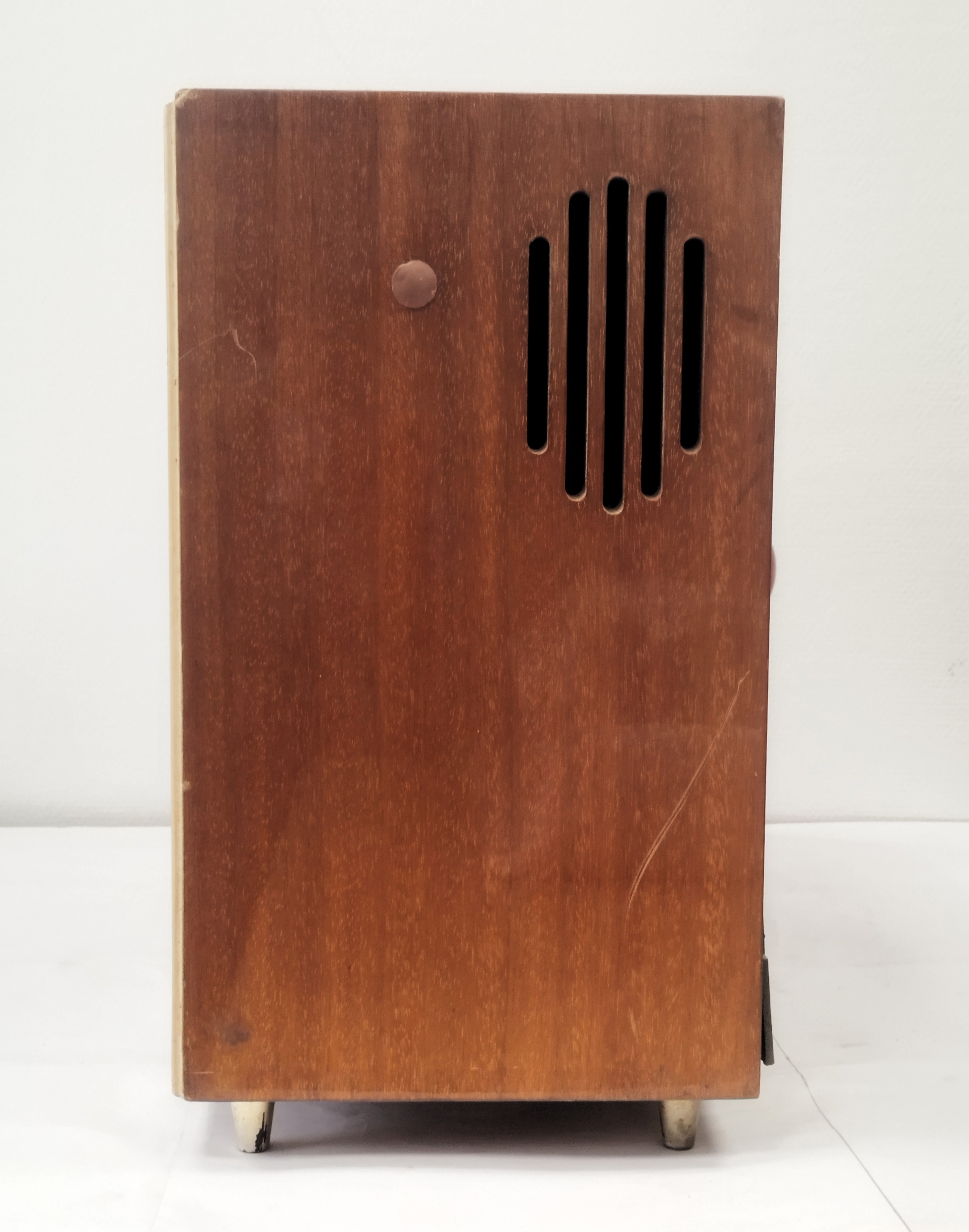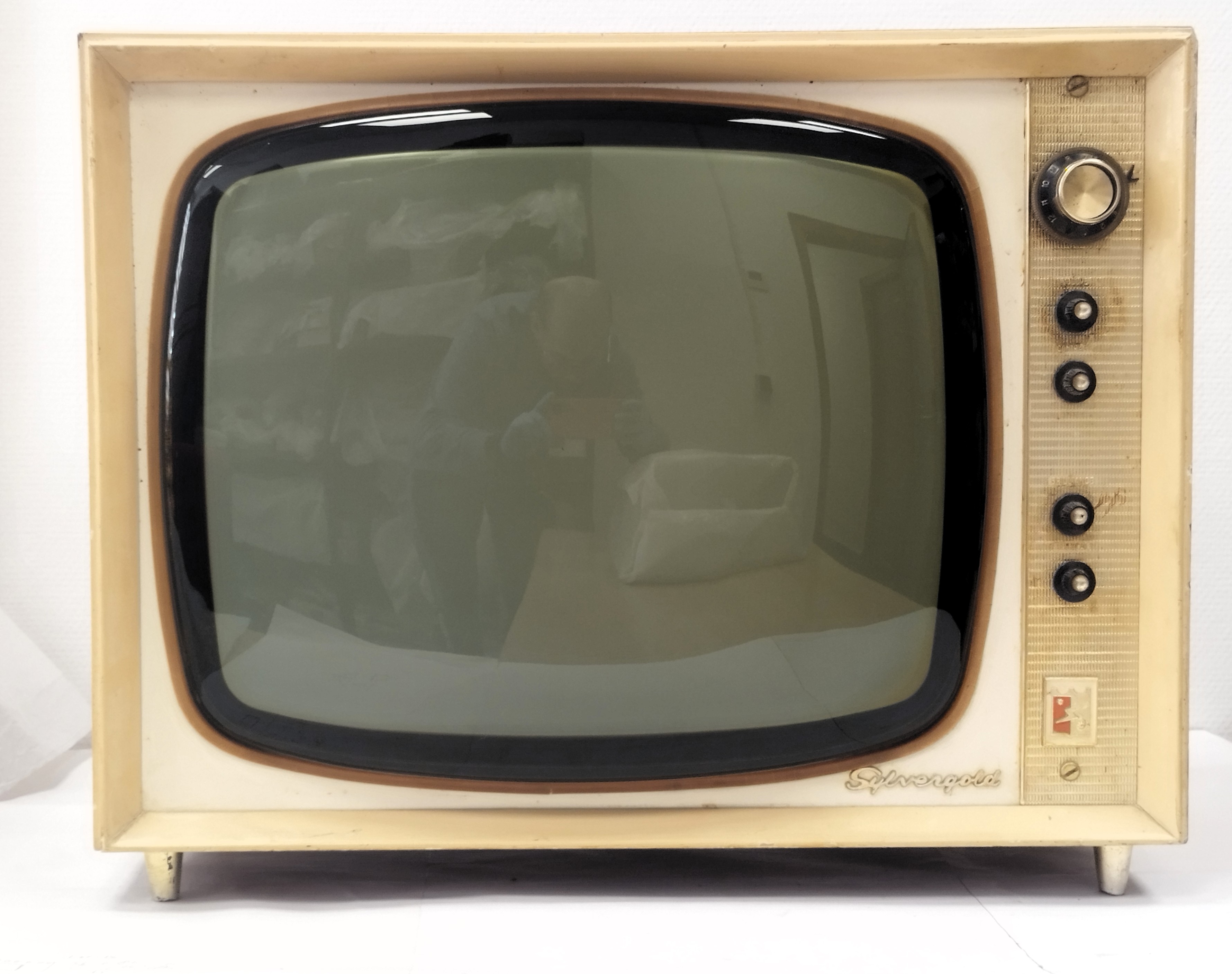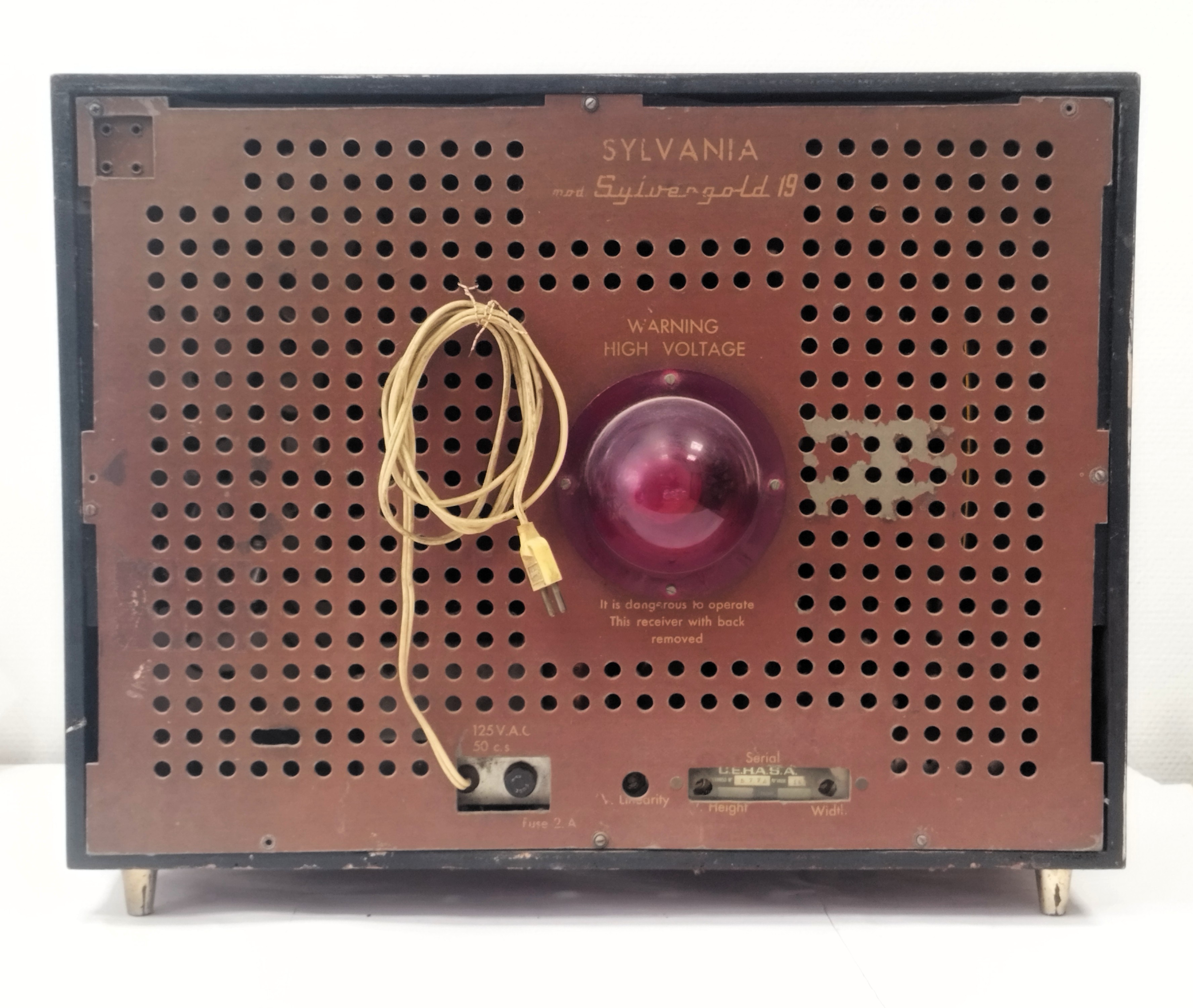 Este televisor Sylvania Sylvergold 19 representa una generación de receptores domésticos fabricados durante la década de 1960, caracterizados por el uso de tecnología de tubos electrónicos y pantallas de cinescopio. Su diseño incorpora una carcasa de madera con acabado claro y un panel frontal con mandos mecánicos para el control de sintonía, volumen y ajustes de imagen.