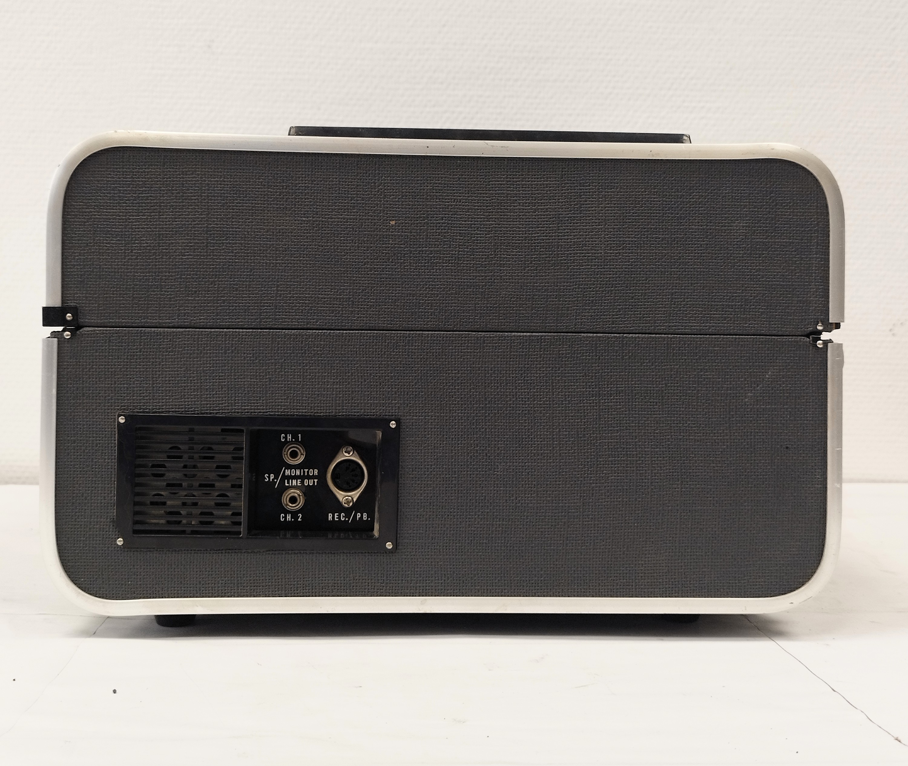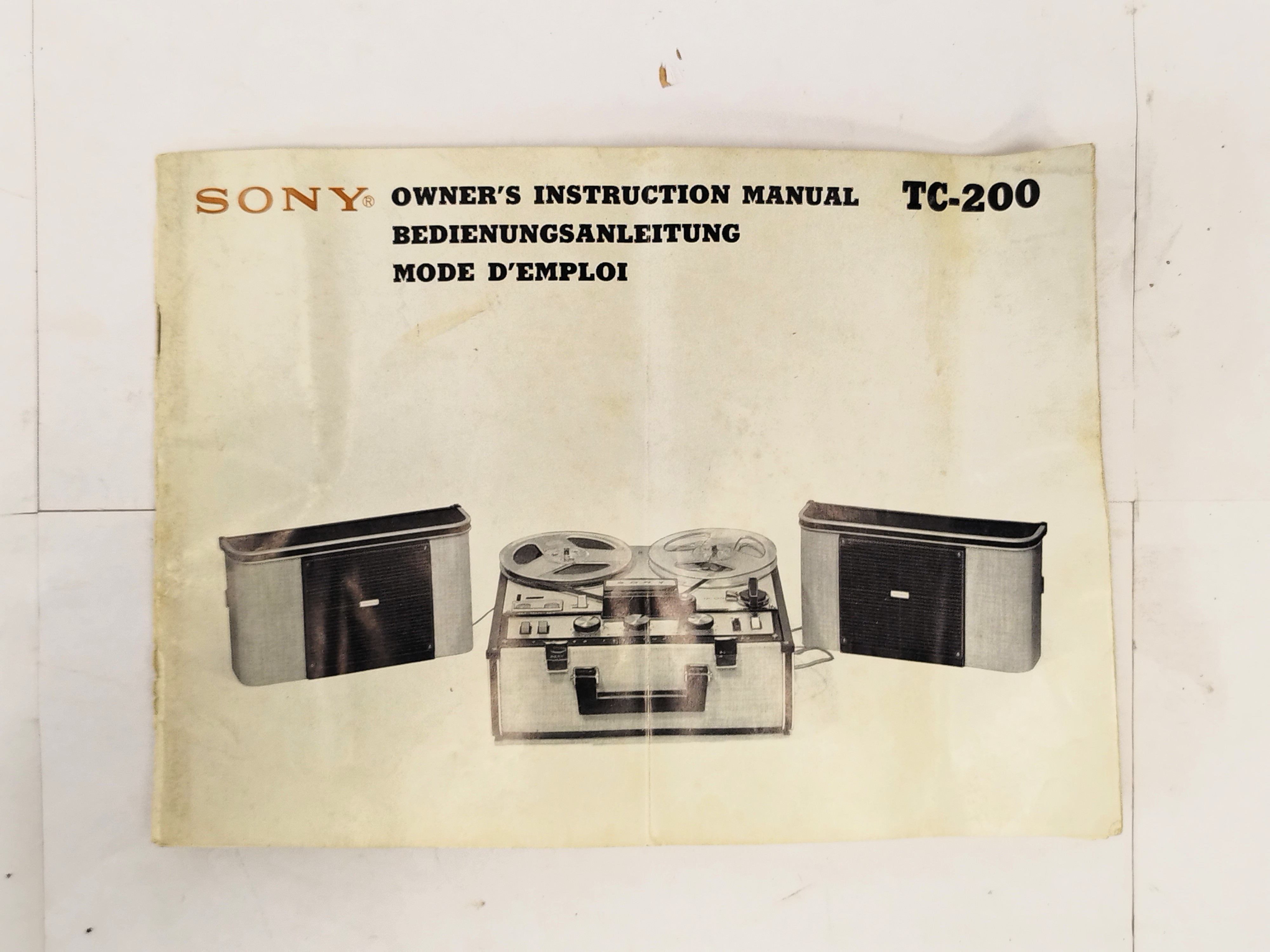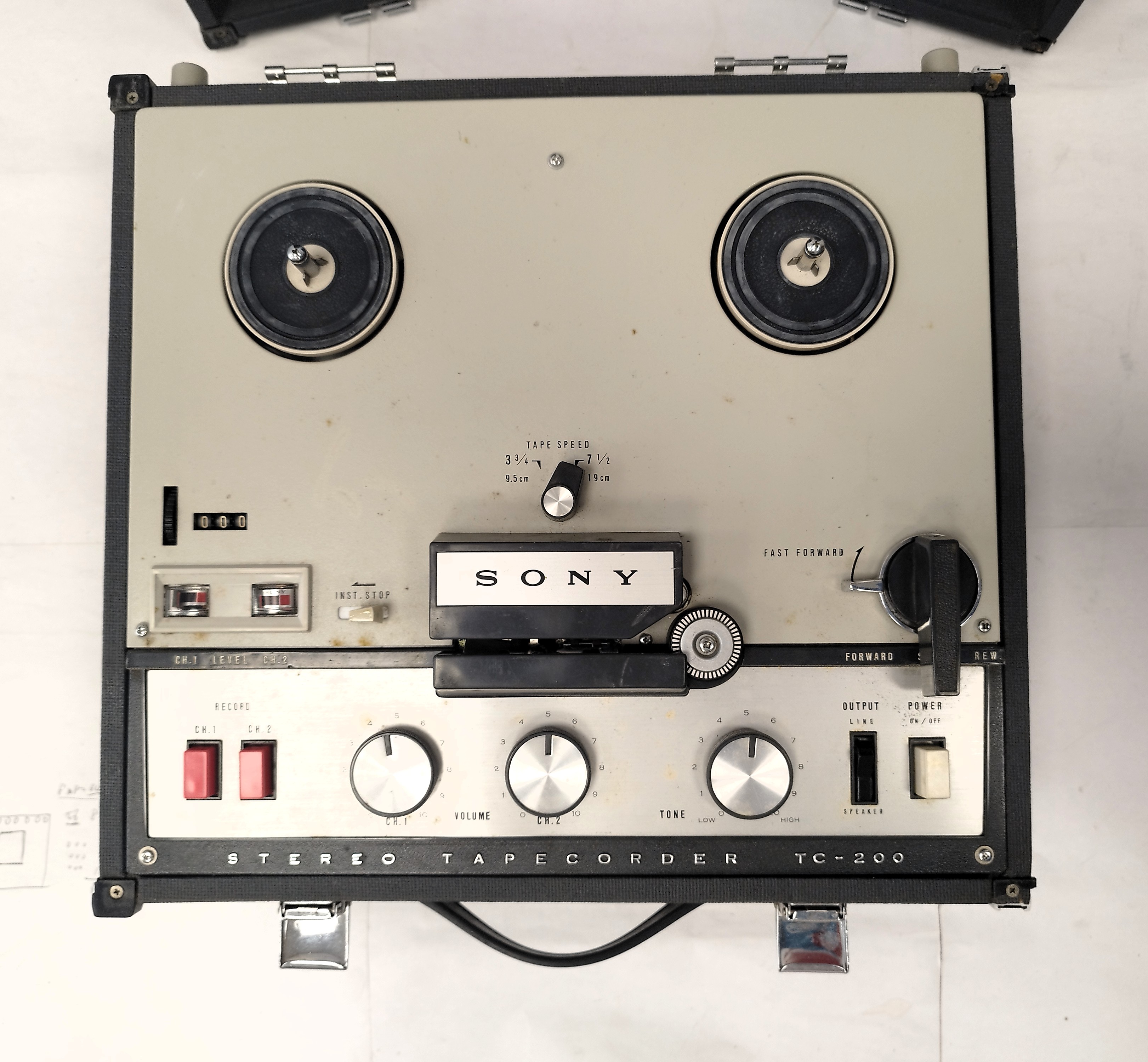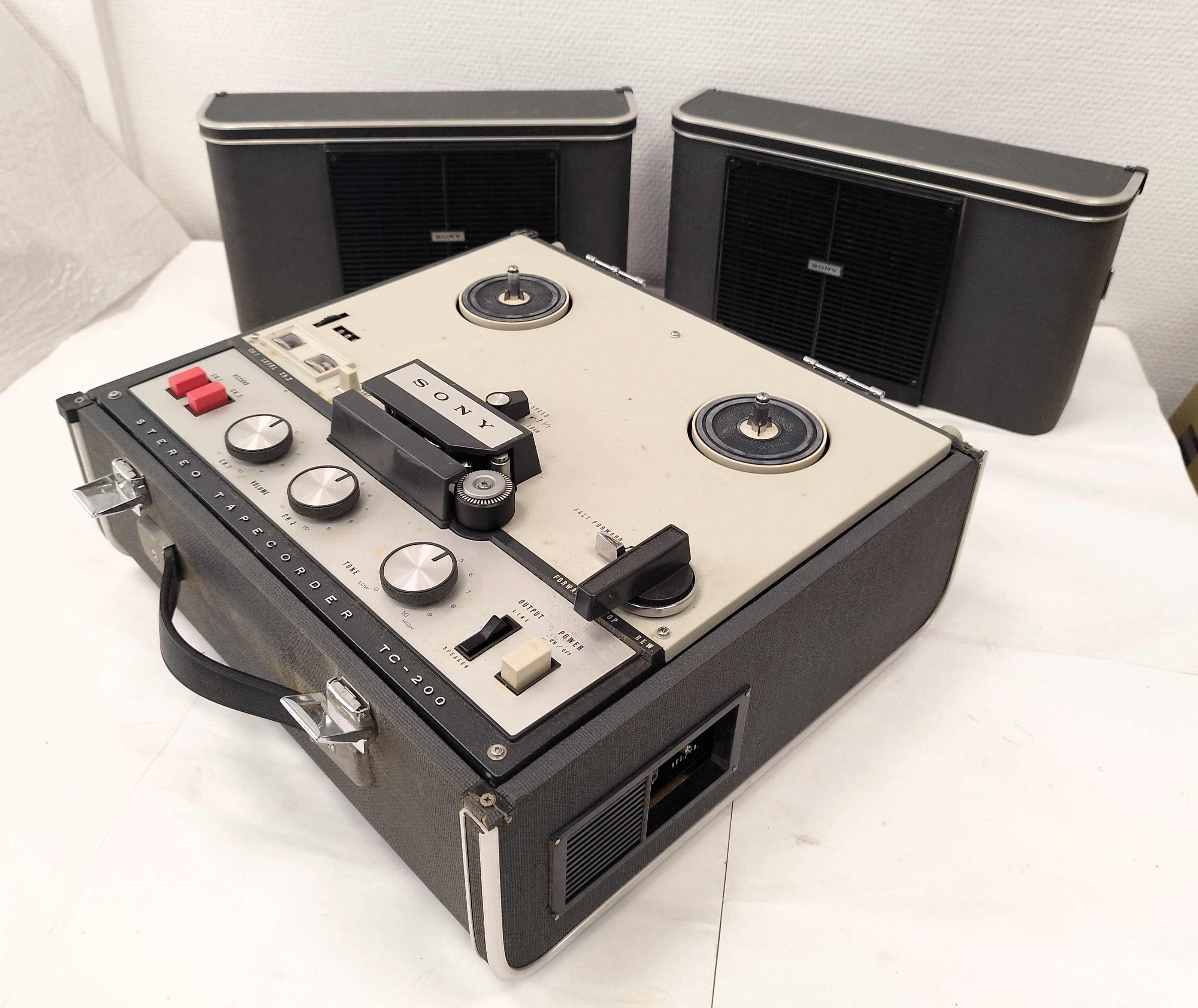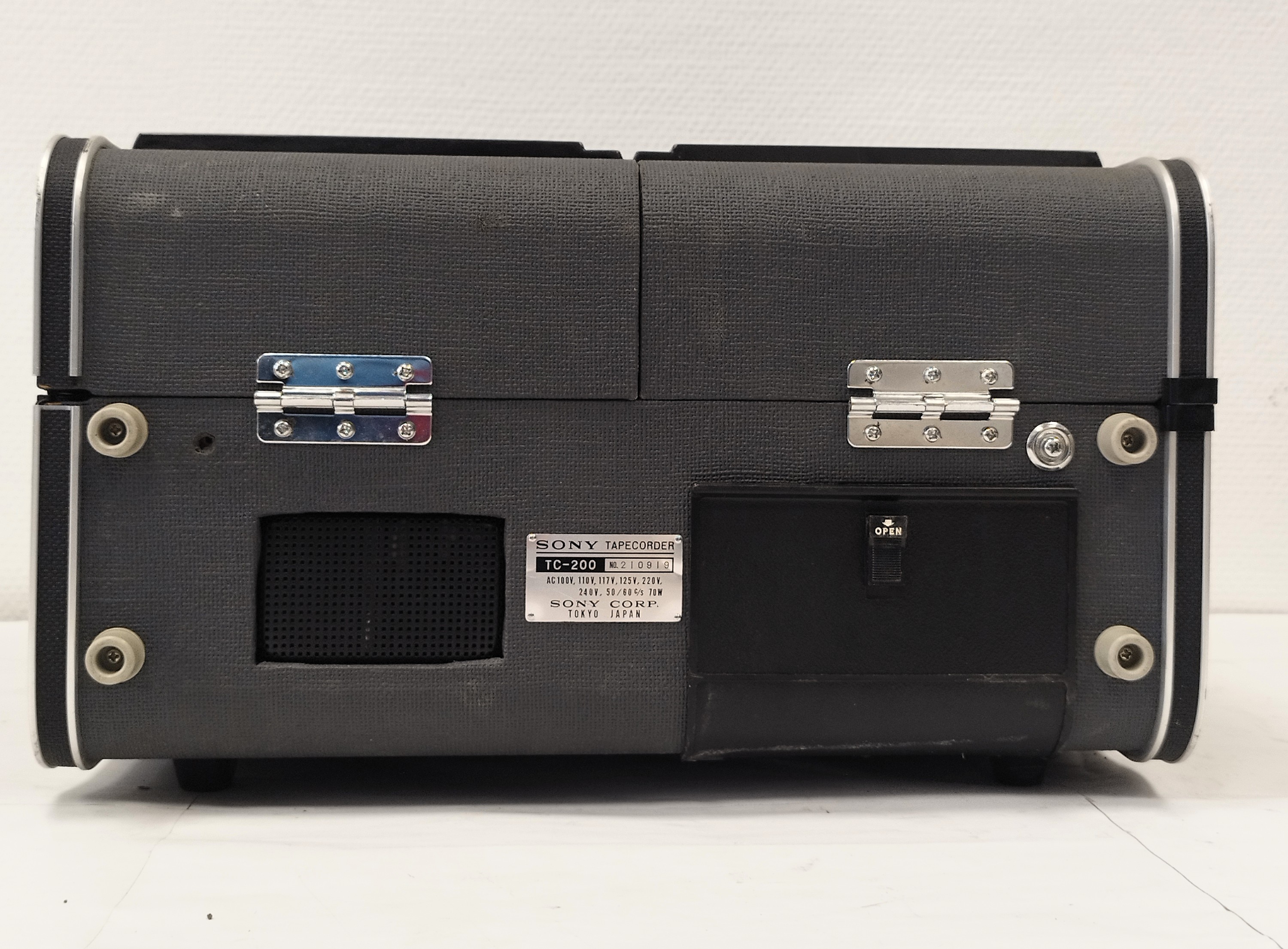 Magnetófono de cinta abierta Sony TC-200, portátil y de diseño compacto, fabricado por Sony en los años 60. Presenta carcasa de madera con tapa desmontable, mandos frontales, vúmetro analógico y altavoz integrado, utilizado para la grabación y reproducción de sonido en cinta magnética, representativo de la tecnología analógica previa al casete.