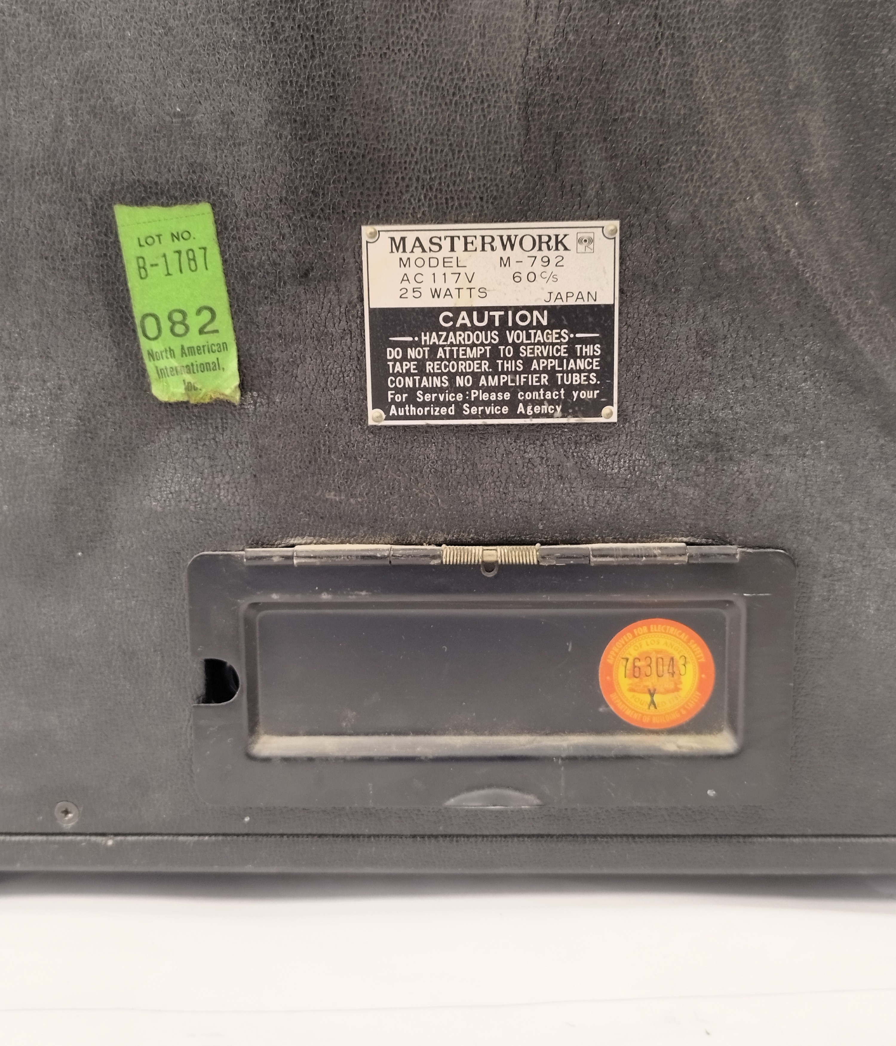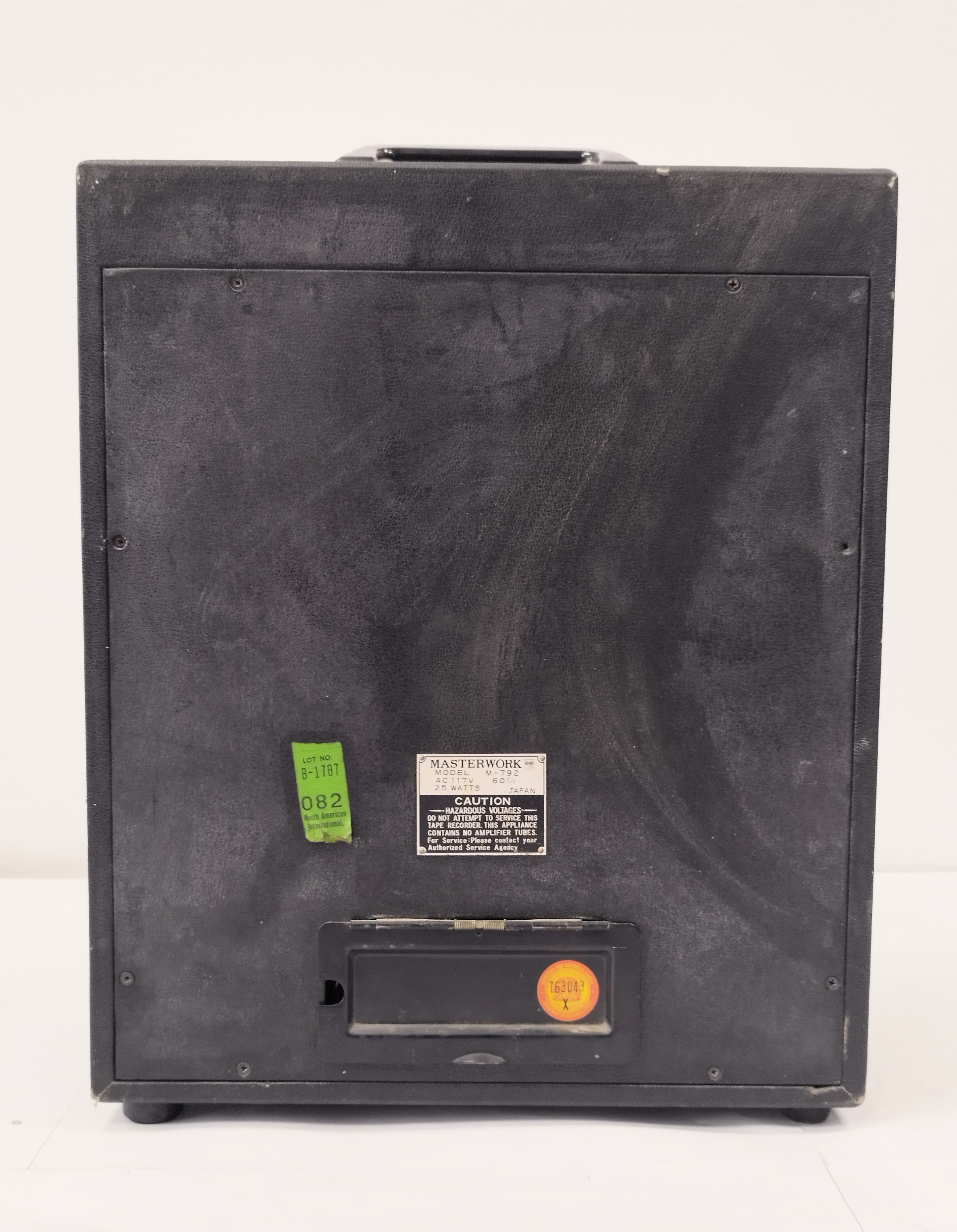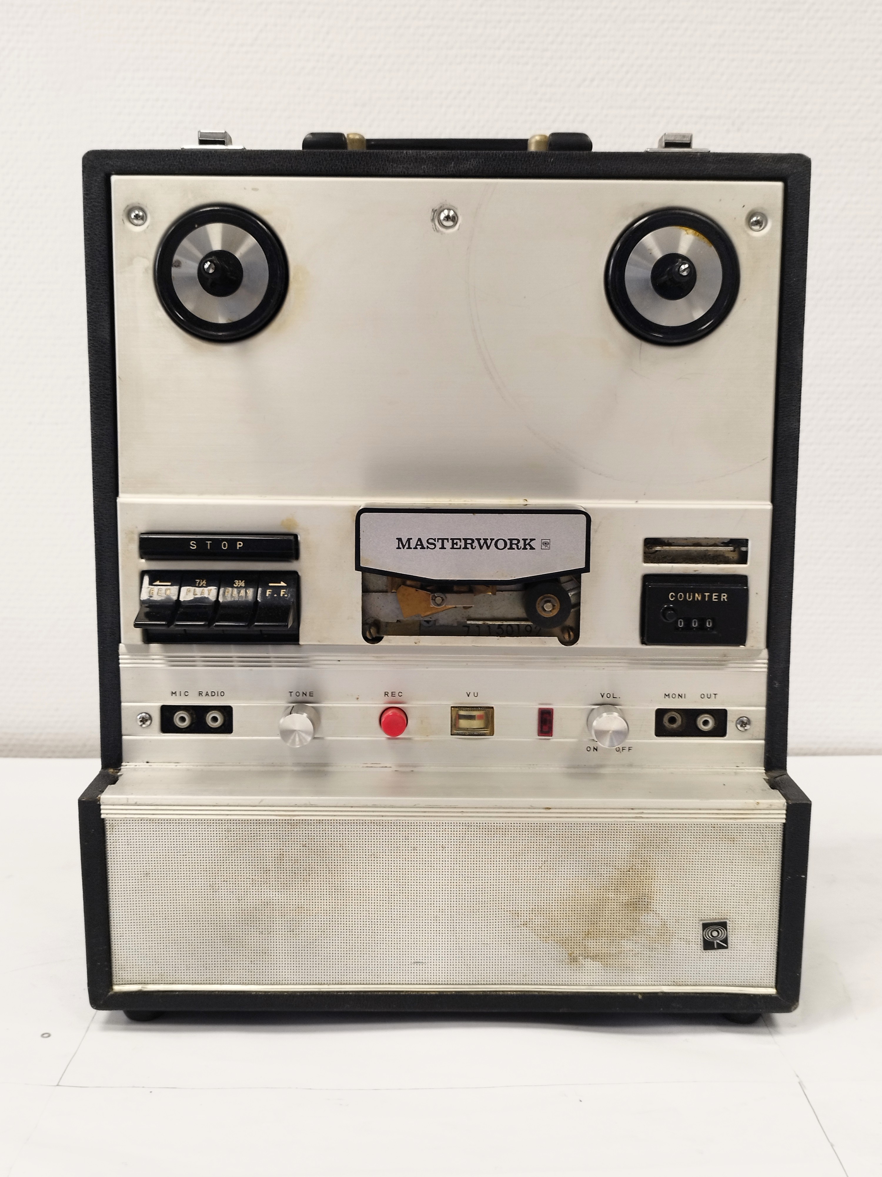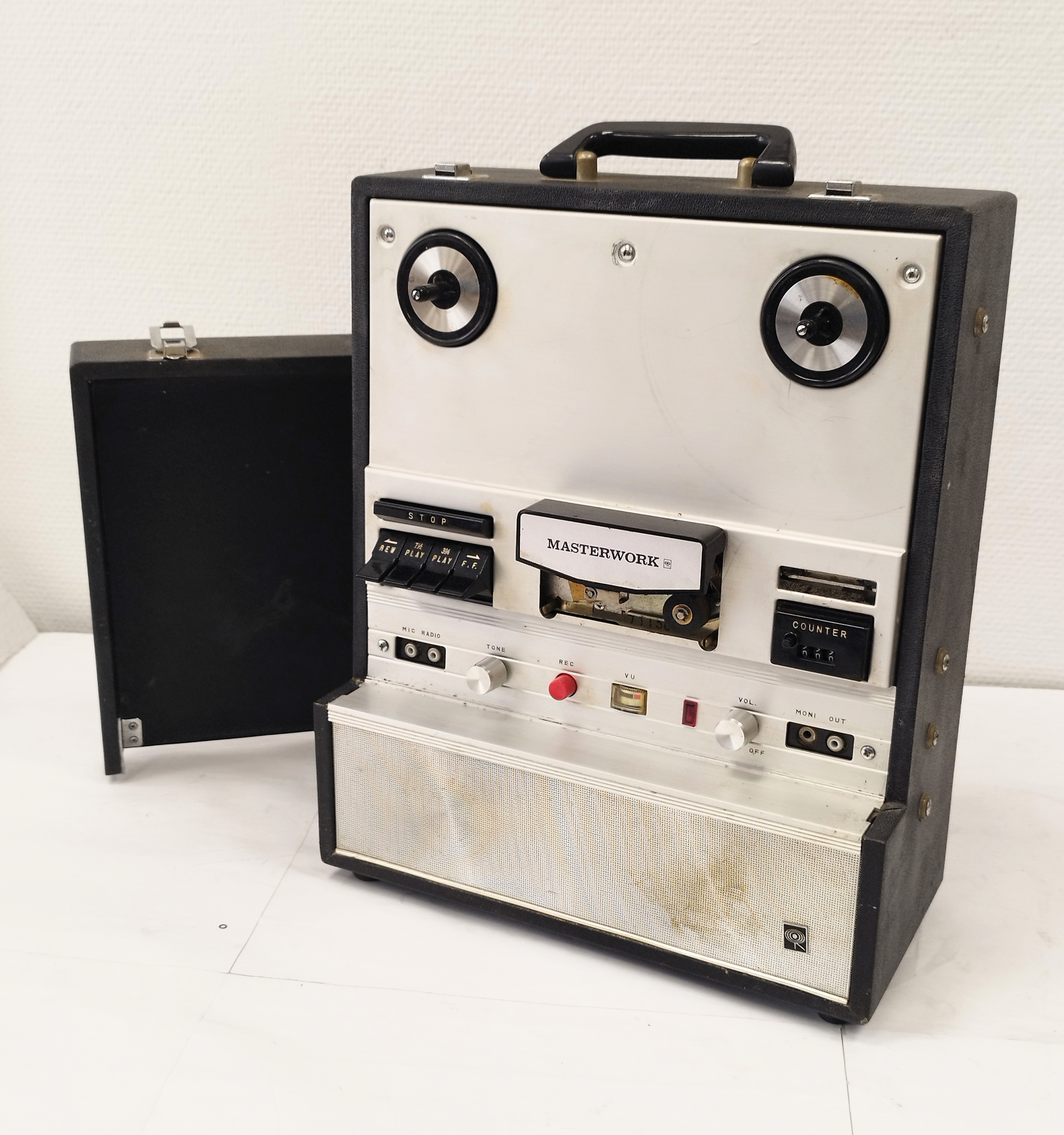 Magnetófono portátil monoaural, de cinta abierta (reel to reel) Masterwork M-792, fabricado en Japón en la década de 1970. Equipado con altavoz integrado, controles básicos de grabación y reproducción, y carcasa metálica con acabado en aluminio cepillado.