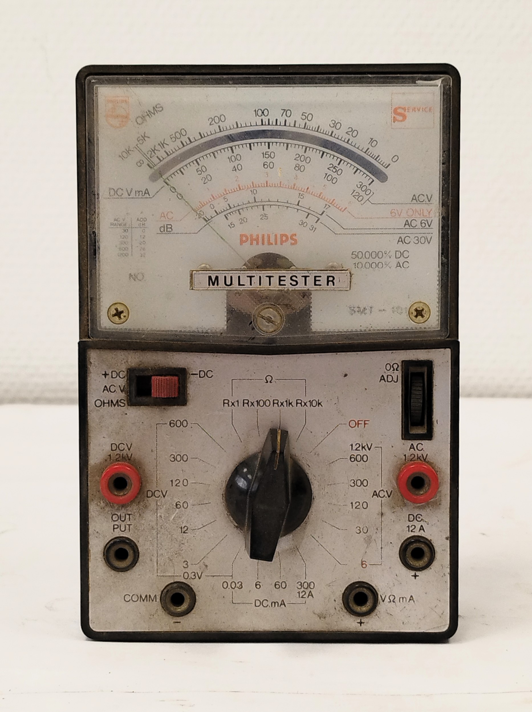 El multímetro (o multitester) analógico Philips SMT-101 mide voltajes DC (corriente continua), voltajes AC (corriente alterna), y ohmios (resistencia), así como decibelios (dB). Incorpora una función de ajuste a cero para la medición de ohmios, un interruptor selector rotativo para las diferentes funciones y rangos, y una clara escala analógica para la lectura de los resultados. Utiliza baterías secas, específicamente 2x 1.5 voltios y 22.5 voltios.