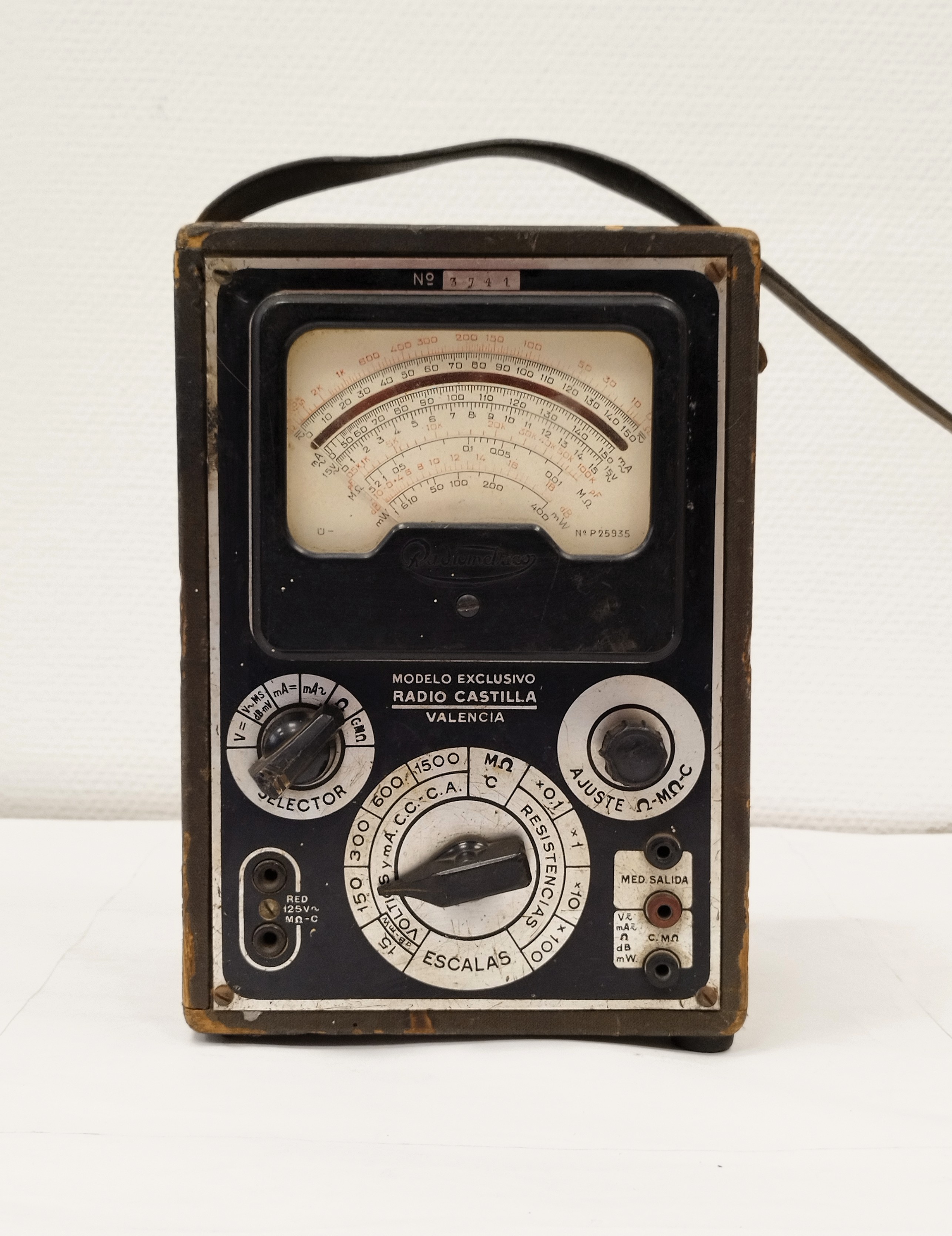 El multímetro EICO modelo Radio Castilla es un dispositivo de medición de voltaje, resistencia y posiblemente corriente. Este modelo en concreto se realizo en exclusiva para Radio Castilla Valencia, una empresa con sede en Valencia dedicada a artículos de radio y electrónica. Cuerpo y panel de control metálicos, con correa de transporte de cuero o material sintético; la caja de soporte combina madera y cuero. Dispone de selector rotativo de escalas, potenciómetro de ajuste y tomas de medición. Presenta signos de uso y desgaste.