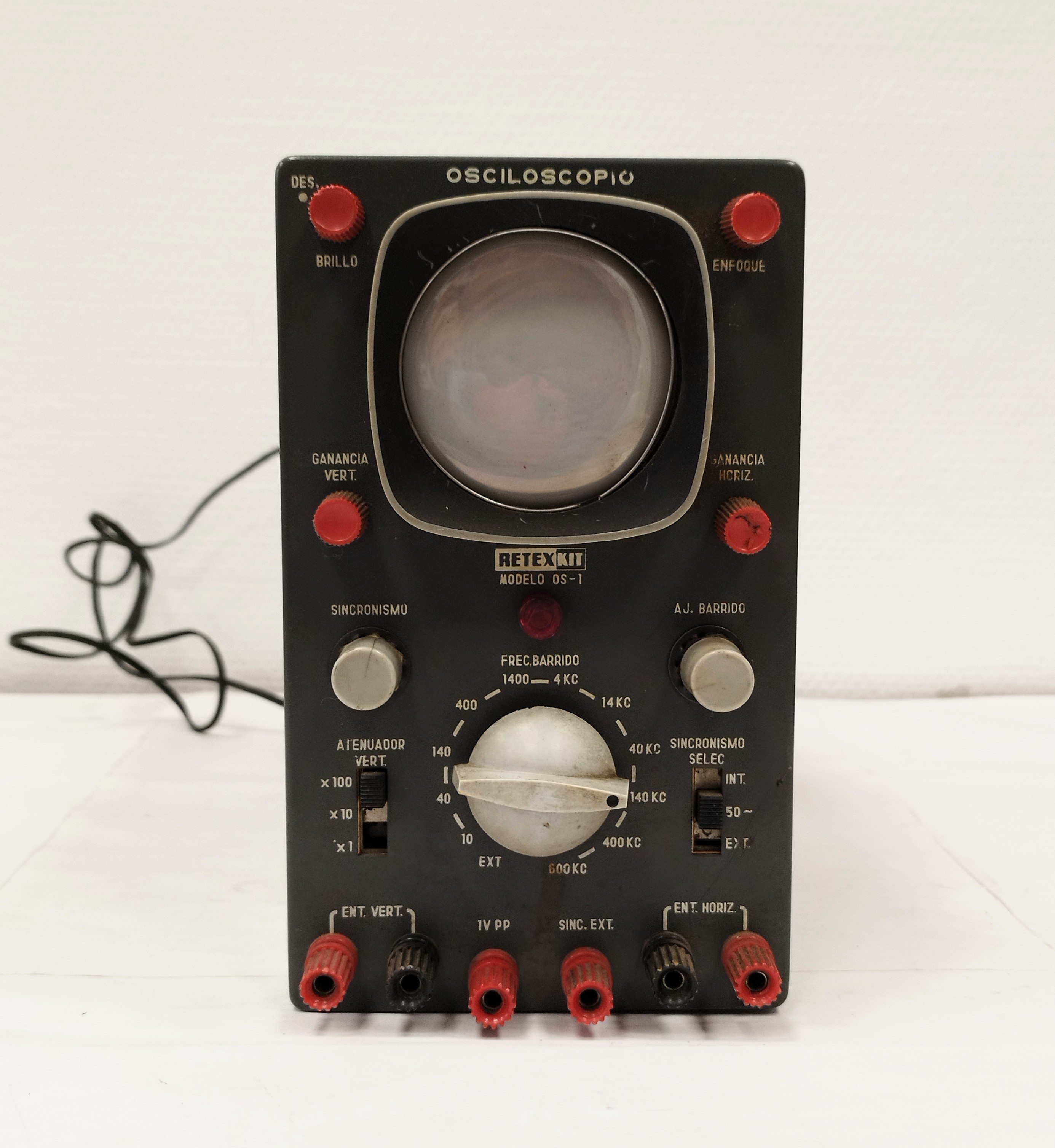 Osciloscopio analógico Retex OS-1 de sobremesa, instrumento electrónico de visualización de señales de voltaje en función del tiempo, utilizado en laboratorios y electrónica educativa; característico por su uso en reparación, diagnóstico y formación técnica.